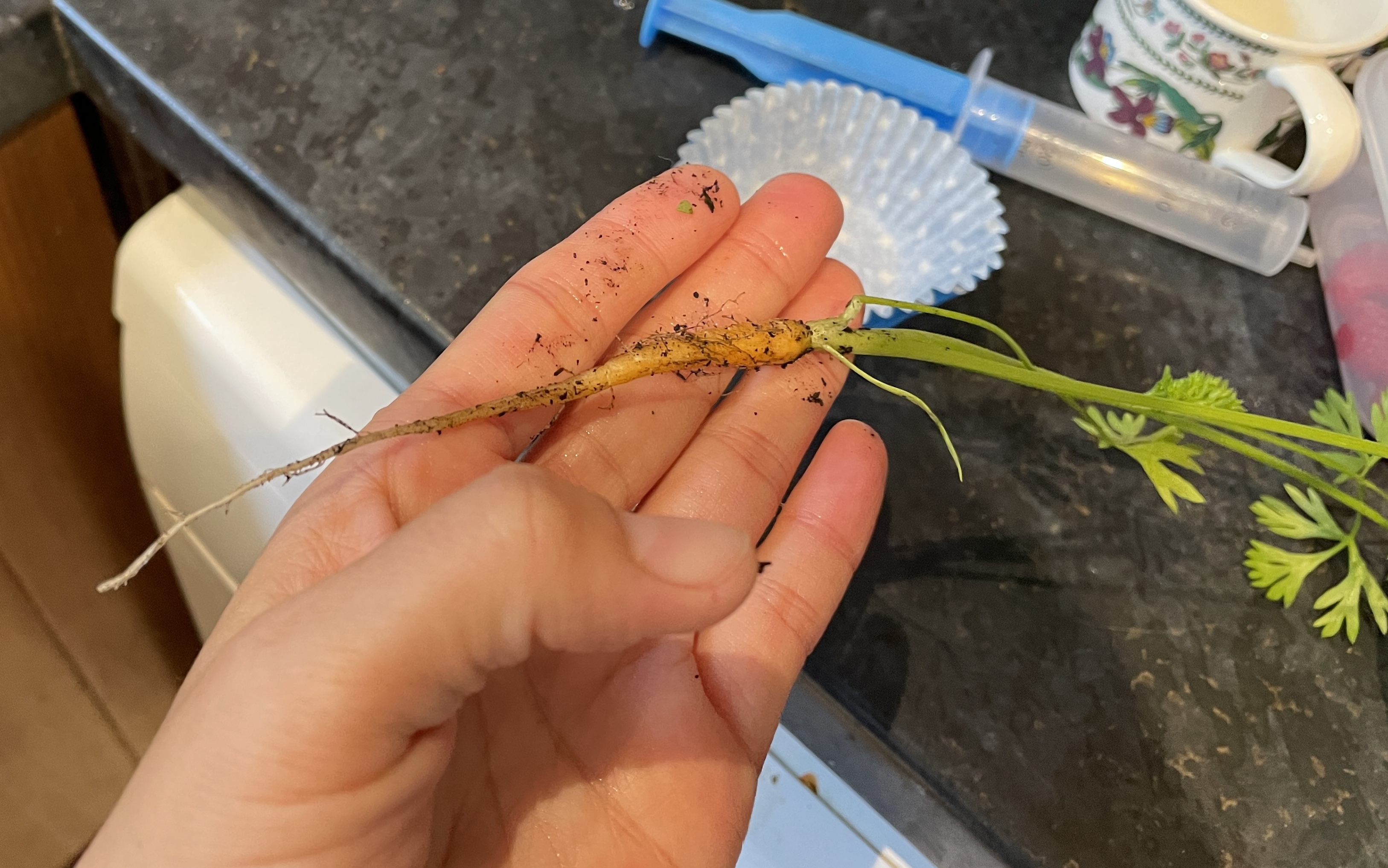 저 당근이 아이 손에 있어서 저 정도로 커 보이지, 어른 손인 제 손에 놓아보면 이렇게 작은 당근이에요.