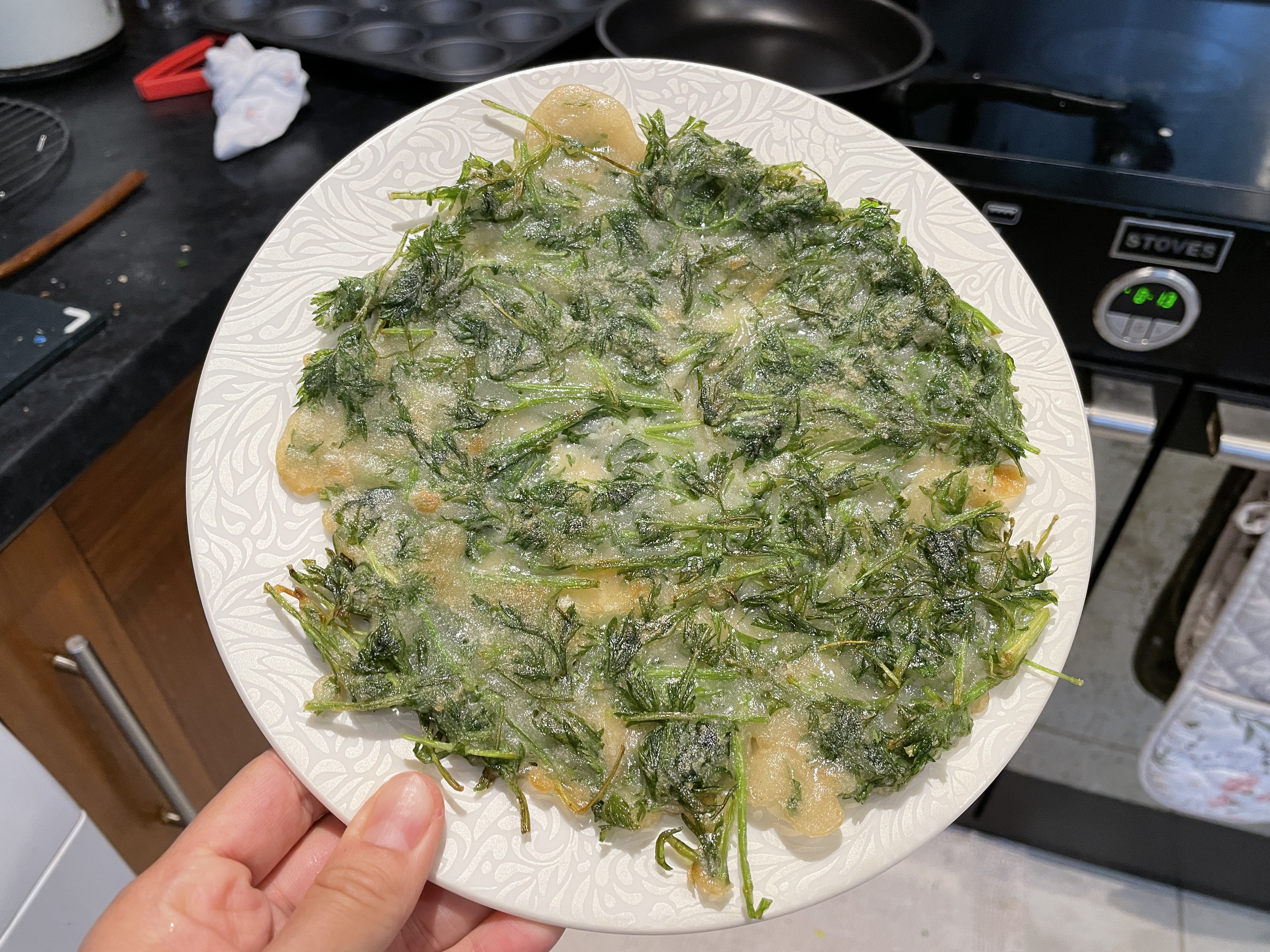 당근잎전을 성공해서 rocket이라는 쌉싸름한 샐러드 채소로도 전을 한번 시도해봤는데요. 그건 전으로는 별로였어요. 그냥 샐러드로 먹으면 쌉싸름한 맛이 고기요리를 먹을 때 곁들이기 좋은 샐러드인데, 전으로 해서 먹으니 끝맛이 좀 텁텁하고 샐러드의 rocket만의 신선한 맛이 사라져버리더라구요.