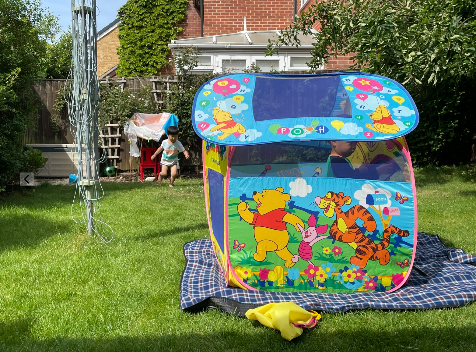 그늘막을 설치하는 김에 집에 있던 놀이텐트를 꺼내서 가든에 설치해줬어요. 저희 둘째 뚱이가 좋아하네요. 저 곰돌이 푸 텐트는 저희 작은 언니의 딸, 그러니까 제 조카가 어릴 때 쓰던 것을 물려받아 한국에서 들고 온 거예요. 그 조카가 지금 고3이랍니다! 우리 수험생 수경이, 입시 화이팅!