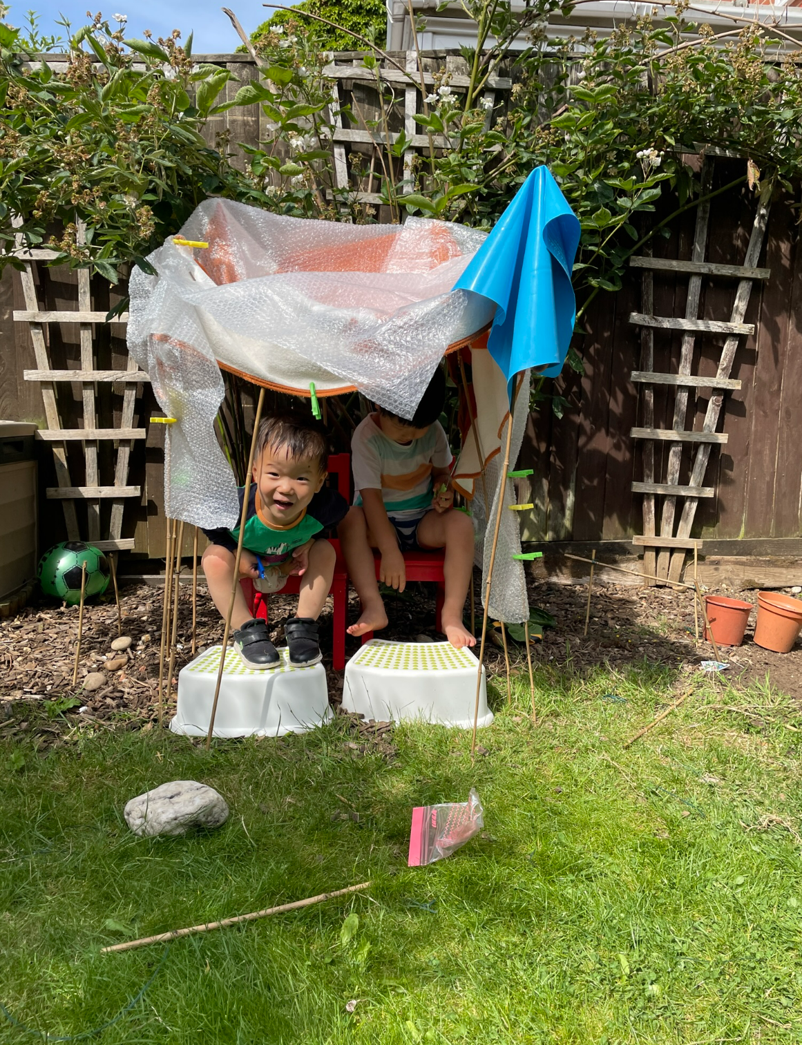먼저 가든 뒷편에 아이들이 셀프로 그늘막을 설치했어요. 남편이 좀 도와줬는데, 저게 말이 그늘막이지 완전 온실입니다.