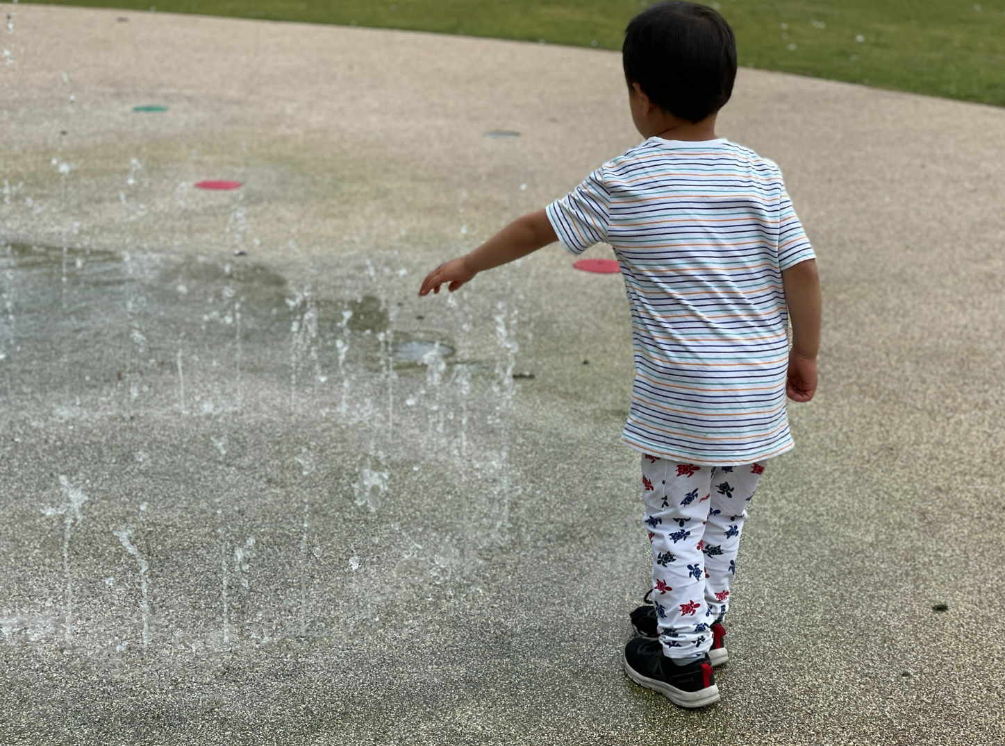 화장실에 갔다가 놀이터로 돌아오는 길에 공원에 있는 스플래쉬 파크에도 들렀어요. 바닥에서 물이 나오는데, 날이 추워서(어제는 20도도 안 된 거 같아요) 아이들은 없고 목마른 거위 한 마리만 물을 마시고 있었어요.