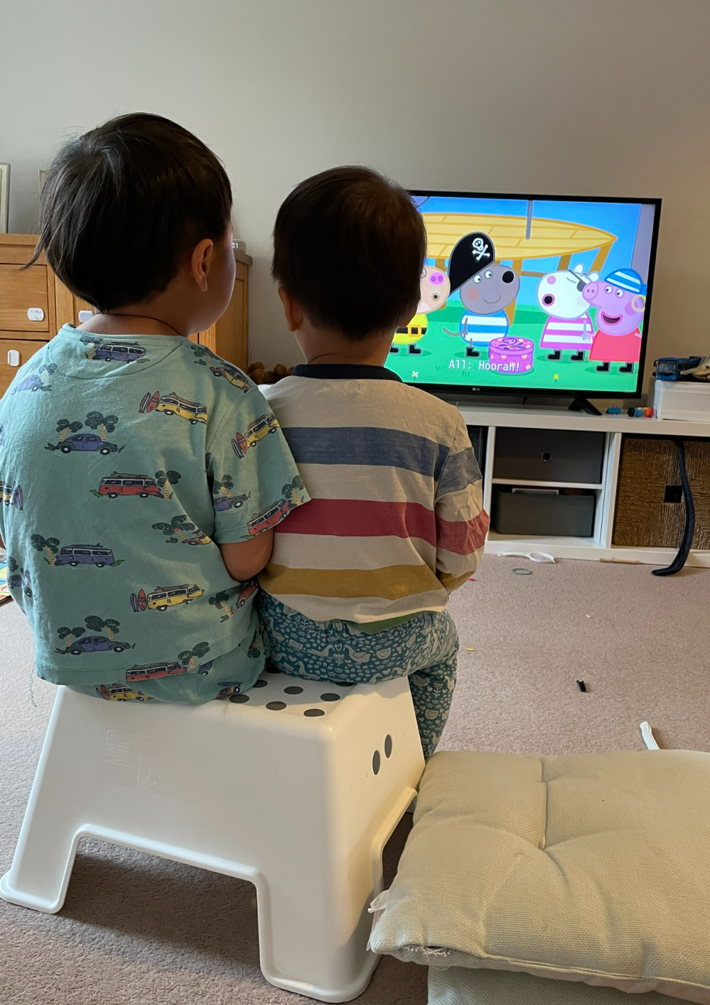 그렇게 신나게 물놀이를 하더니 다음날부터 아이들이 매우 피곤해하네요. ㅋㅋ 그래서 금요일부터는 티비 시청을 시작했습니다. 형아가 앉아있는 발판에 굳이 끼어서 앉으려는 뚱이. 형아가 하는 거라면 다 하고 싶어합니다. 저렇게 함께 앉아있는 것도 3초. 이내 뚱이는 형아 궁뎅이에 밀려 그 옆에 있는 방석에 앉았습니다.
