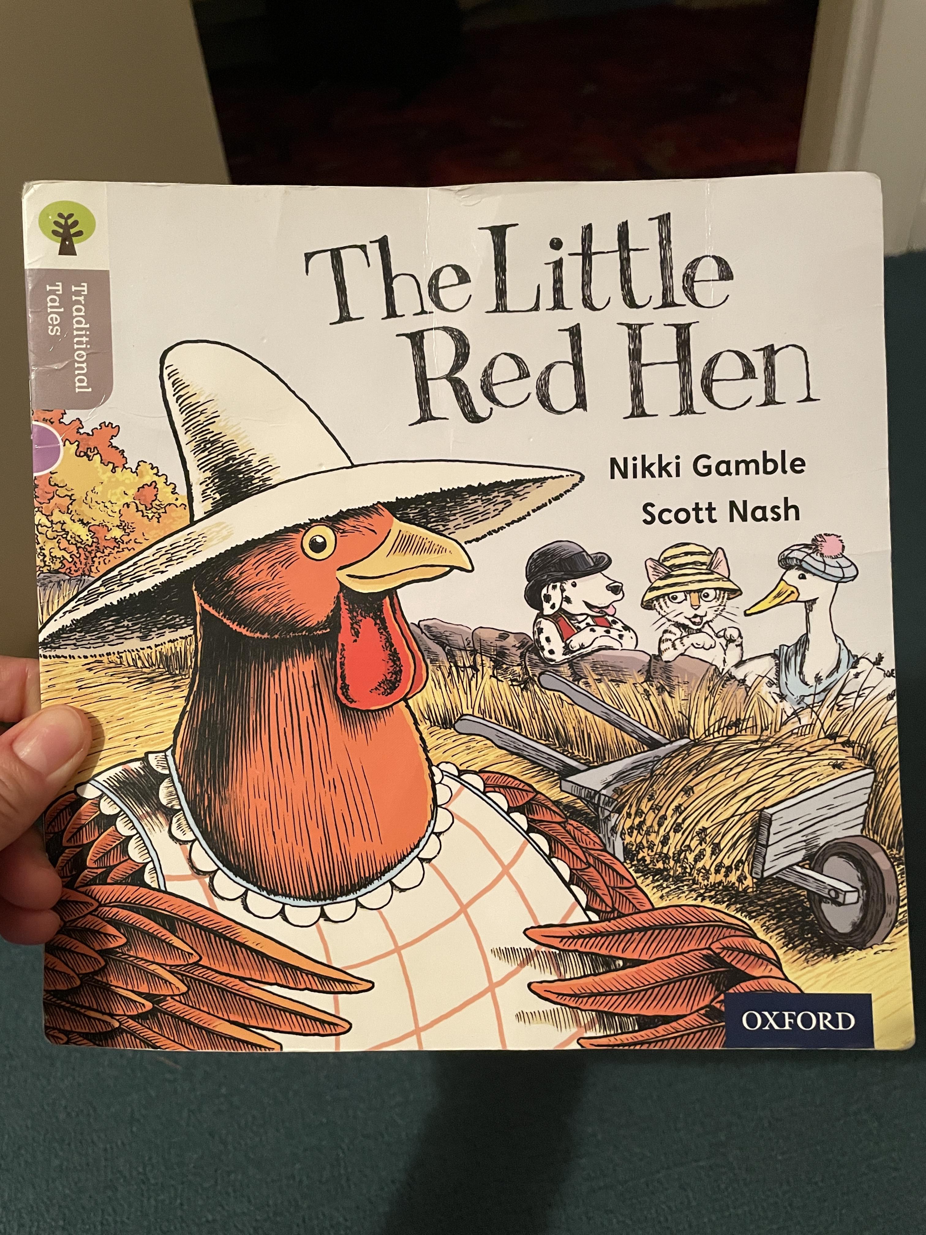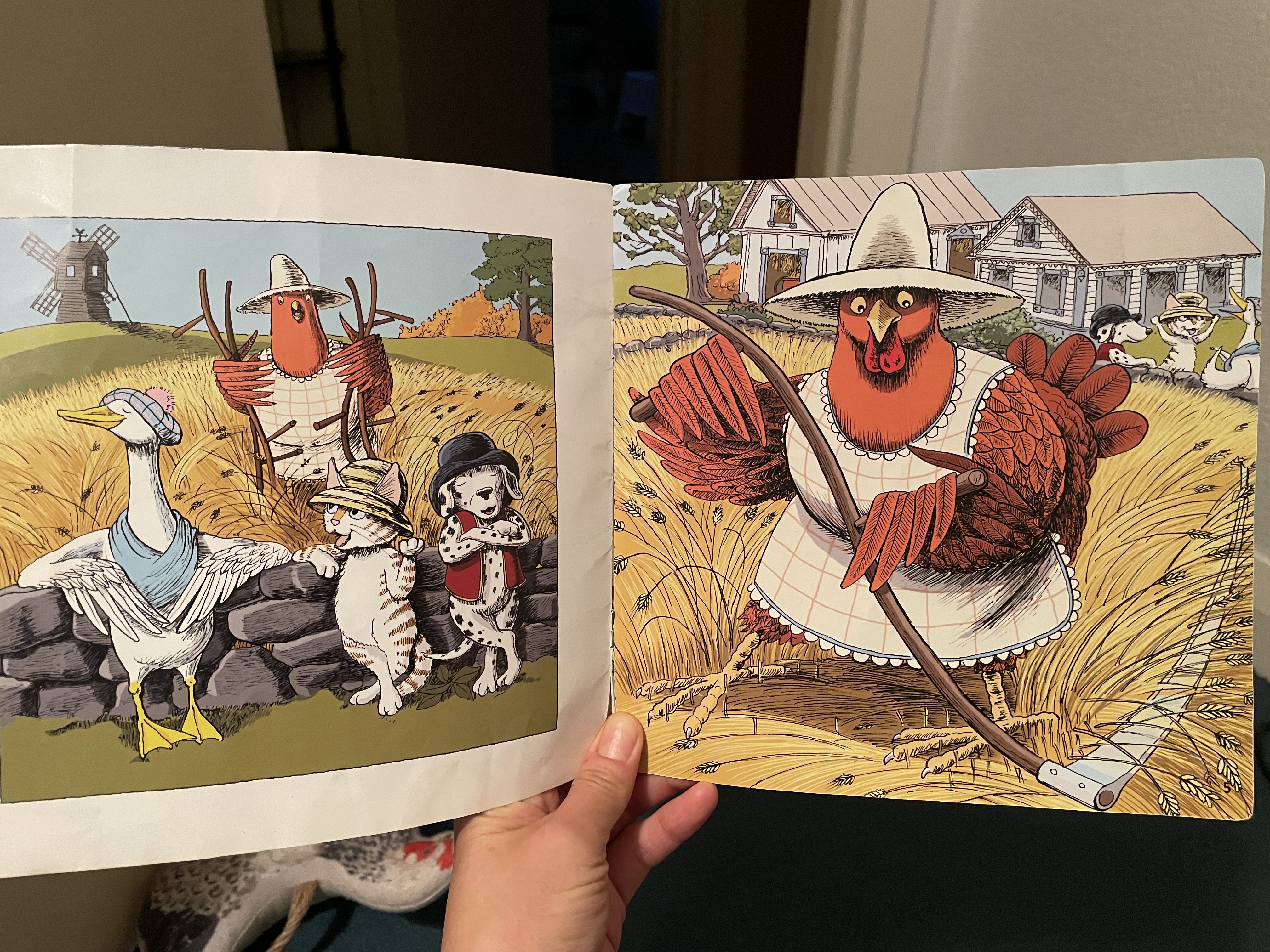 이 책은 암탉이 밭일을 하며 다른 동물들에게 같이 일을 하자고 하는데, 다른 세 동물들은 일을 하지 않고 놀기만 해요. 혼자가 열심히 일한 암탉은 밀을 수확해서 밀가루를 만들어 맛난 빵을 구워먹는데, 다른 동물들은 그러지 못했죠. 암탉은 다른 동물들에게 빵을 나눠줬고, 이후 함께 빵을 나눠 먹은 동물들은 마음을 고쳐먹고 암탉과 함께 농사에 동참하게 됐다는 이야기입니다.
