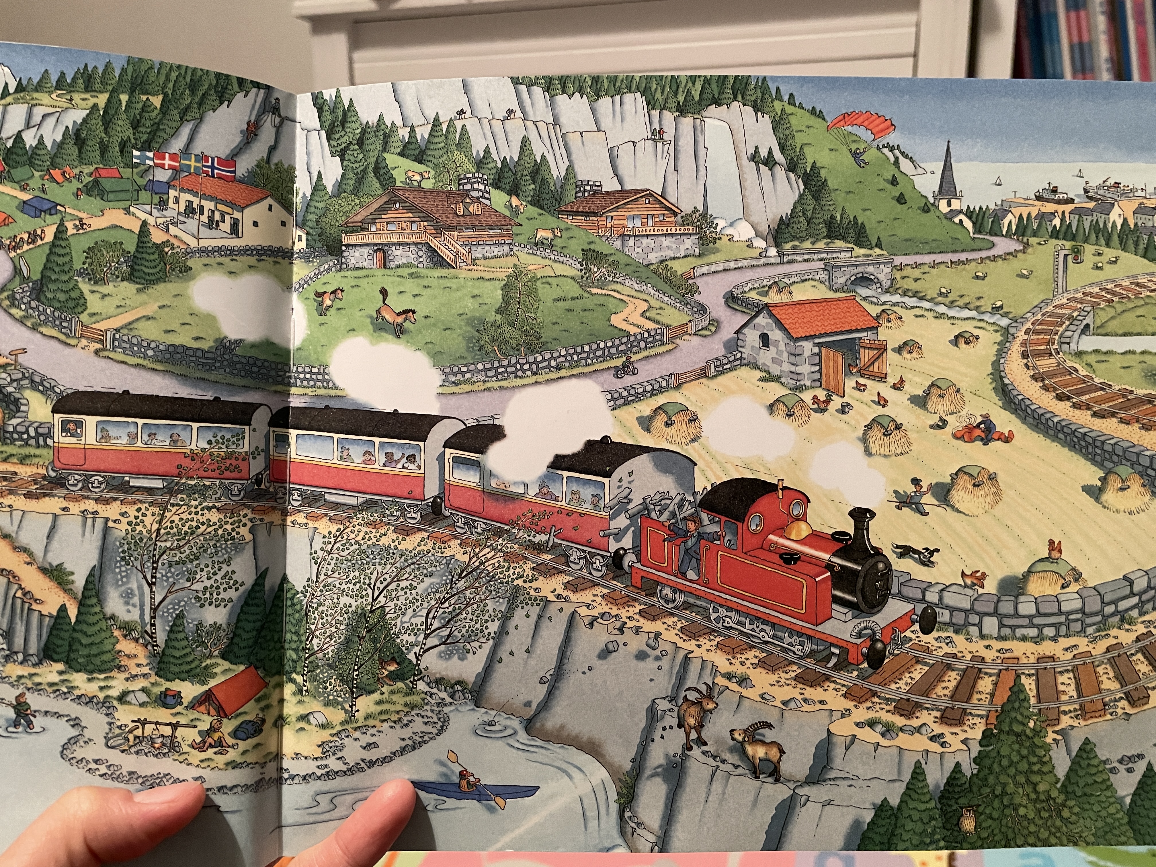 각 페이지마다 각 나라의 상징적인 것들이 그림으로 잘 묘사되어 있고, 여행기도 재미있어서 아이들이 좋아해요~ 위 스위스 그림에서 패러글라이딩 하는 사람도 있고, 땅에 안전하게 착륙한 사람도 보이고~