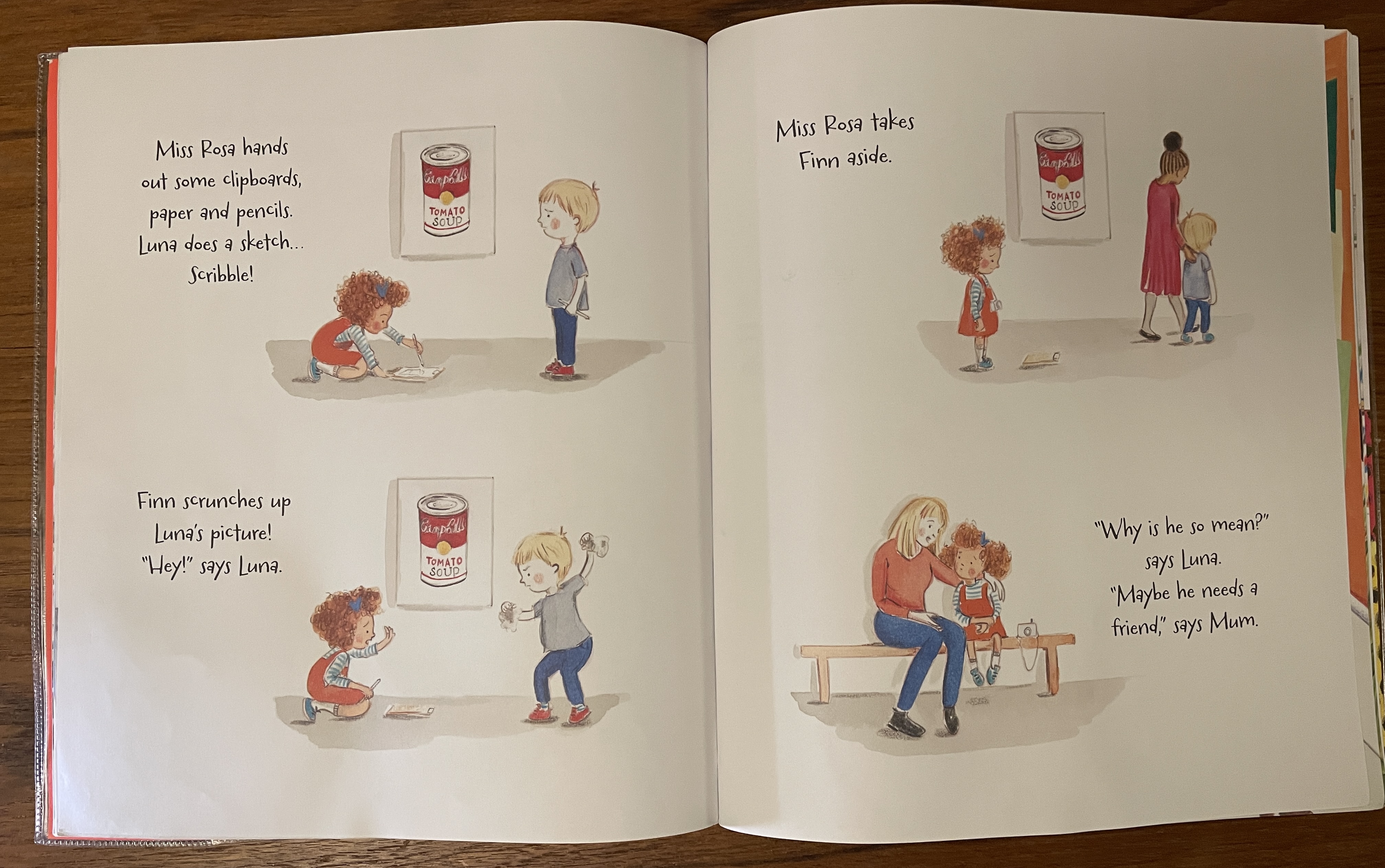 미술관에 가서 기분이 좋은 루나와는 달리 바닥만 쳐다보는 핀(Finn)이라는 친구가 있었어요. 이 친구는 아마 가정 환경도 루나와 다르고, 미술관에 온 것이 뭔가 어색하고 떨떠름하고 같이 어울릴 친구도 없어요.