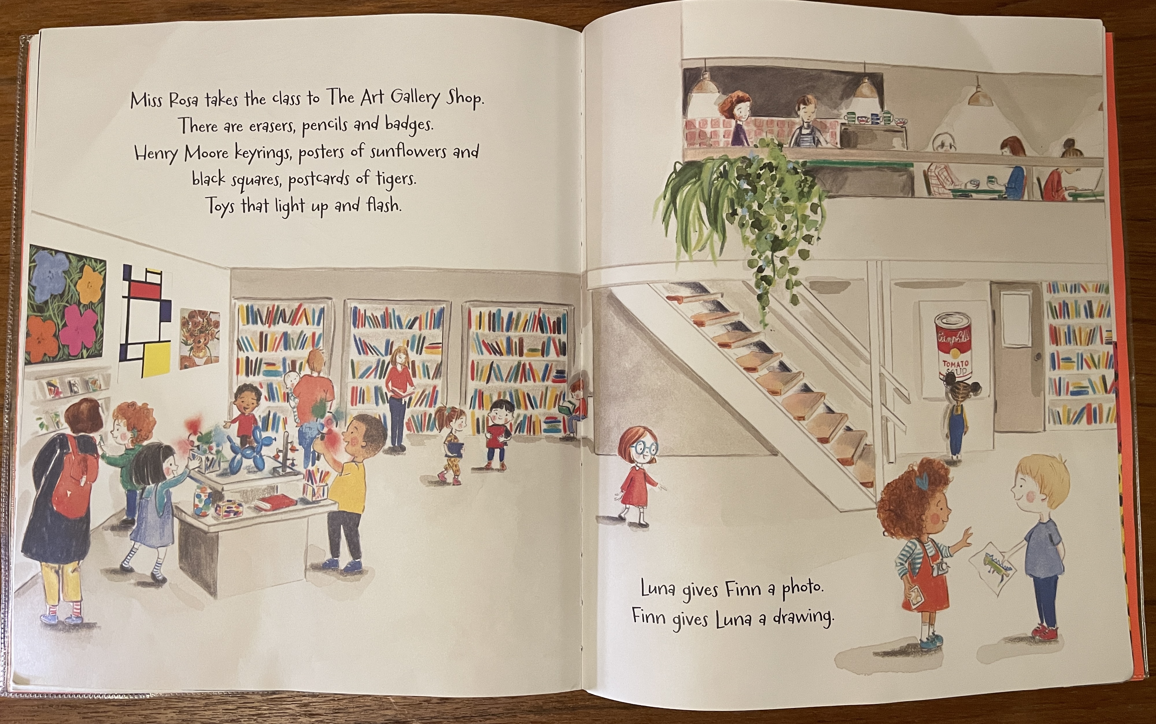 미술관 기념품 가게에도 어린 아가를 안고 온 아줌마가 보이시나요? 저런 디테일.. 아기를 데리고 미술관에 온 엄마도 그려내는 디테일이 참 좋습니다. 샵 뒤로는 미술관 카페도 보입니다. 저도 한 때는 미술은 잘 몰라도 미술관을 둘러보고 미술관 카페에서 커피 한잔의 여유를 즐기고 기념품 가게에서 소소한 기념품을 사서 추억을 남기던 시절이 있었는데… 하고 저도 잠시 추억여행을 떠나게 해주는 책!