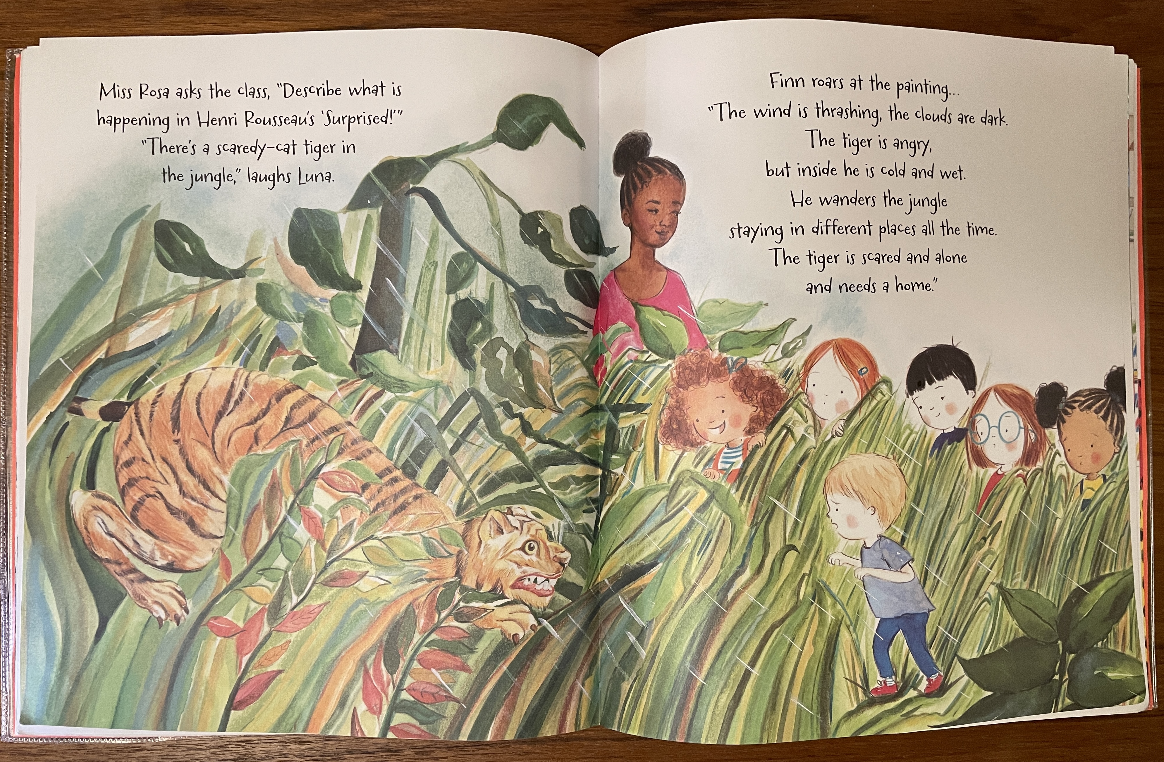 잠시 루 미술작품을 관람하며 작품에 대한 이야기를 나누는데… 같은 그림을 보고도 루나는 그저 해맑게 생각하고 이야기했지만 핀은 저 풀 속의 호랑이가 겉은 화가 났지만 속은 외롭고 무서우며, 이곳 저곳을 돌아다니는데 실은 외롭고 집이 필요한 것 같다고 이야기를 합니다.