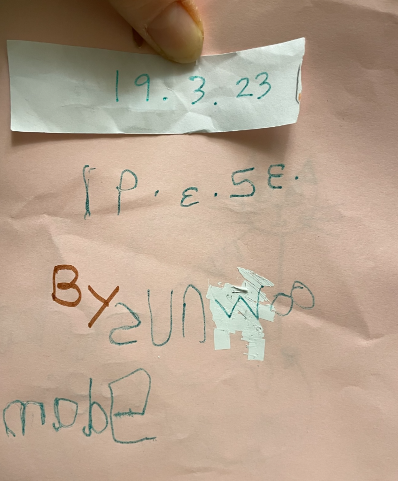 아래는 올해 3월 19일에 아이가 스스로 만든 '고양이에 대한 책'의 표지면입니다. 영국에서는 23년 3월 19일을 19일 3월 23년 순으로 써요. 그래서 아이에게 숫자쓰기를 장려하기 위해 모든 책에는 발행일을 쓰는 거라며, 오늘 날짜를 기록하자고 했습니다. 숫자쓰기에 자신이 없던 아이는 저에게 숫자를 대신 써달래요. 그래서 '대신 써주는 거 말고, 엄마가 써줄테니 엄마가 쓴 거 보면서 직접 써볼래?' 하며 제가 쓴 숫자를 아이에게 보였습니다. 제가 쓴 날짜를 보고 따라 쓴 아이. 숫자를 모두 좌우 뒤집어 썼습니다. 놀랍게도 모든 숫자를 정확하게 다 뒤집었어요. ㅋㅋㅋㅋ 이름에 들어가는 S도 여전히 좌우 뒤집혀있습니다. 맨 마지막에는 made 라고 쓴다는 것이 그것도 m 과 e를 제외하고 모두 뒤집어서 썼습니다. 그래도 스스로 글씨를 쓴 게 어딘가, 그것만 해도 굉장한 성과입니다.