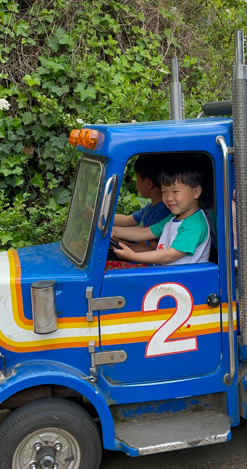***사진: 지난 주말 생애 첫 놀이동산에서 어린이 차에 탑승한 아이들. 첫째는 새로운 환경이 신기하고, 엄마 아빠와 떨어져 앉아서 주위 환경 탐색에 여념이 없는데, 둘째 뚱이는 자동차 운전석처럼 생긴 곳에 앉은 것만으로도 웃음이 활~짝~***