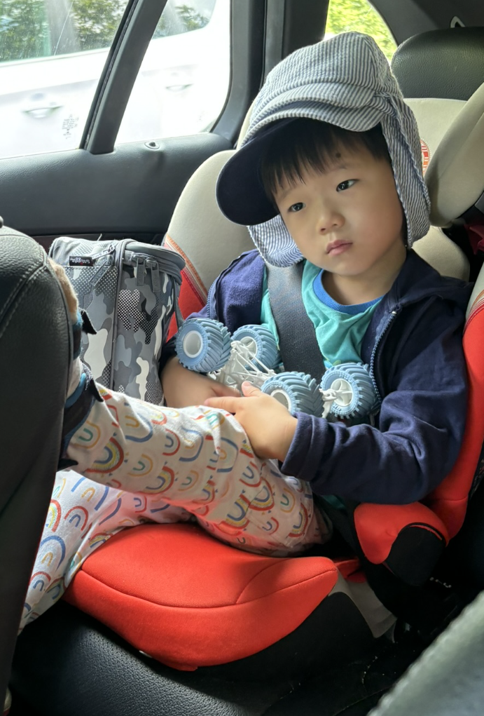 자기가 좋아하는 것을 겹겹이 쓰는 것을 좋아한다. 작년 겨울에는 장갑을 꼭 그렇게 각 손마다 두겹을 꼈다. 그러니까 한 손에 장갑 한켤레씩을 다 끼는 것이다. 여름이 되자 모자를 세 개씩 썼다. 형아 잭은 제발 모자 쓰라고 사정해야 겨우 쓰는 모자를 둘째는 하나 쓰고, 그 위에 쓰고, 또 쓰는 게 신기하기만 하다. 첫째 잭은 해가 너무 강한 날 얼굴에 썬로션 바르는 걸 피하려고 모자를 겨우 쓰는 편인데 말이다.