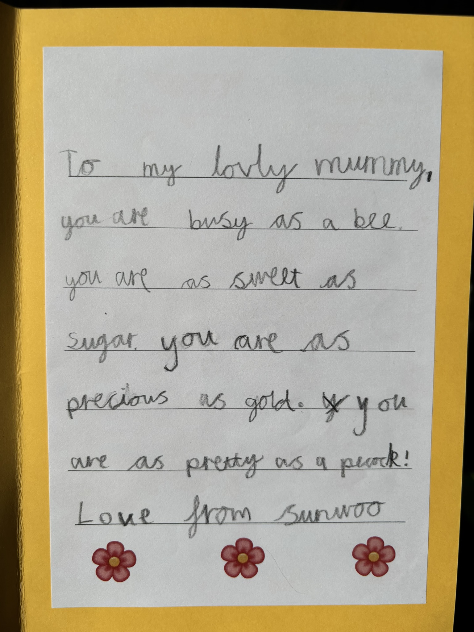 이건 엄마만 알아볼 수 있는 글씨. 카드의 윗부분은 뒤집어서 쓰다가, 아랫 부분은 반대로 뒤집어서 쓴 모양이다.Happy 와 To mummy 가 뒤집어져있는 걸 볼 수 있다. 엄마에 대한 사랑을 가득담아 xxxxx 키스는 다섯번이나 날려줬고, 하트도 이쁘게 그려뒀다. 열심히 쓰던 카드를 왜 뒤집었을까. 마지막 두 줄은 자기 이름만 빼고 다 알아볼 수 있게 잘 적었다.