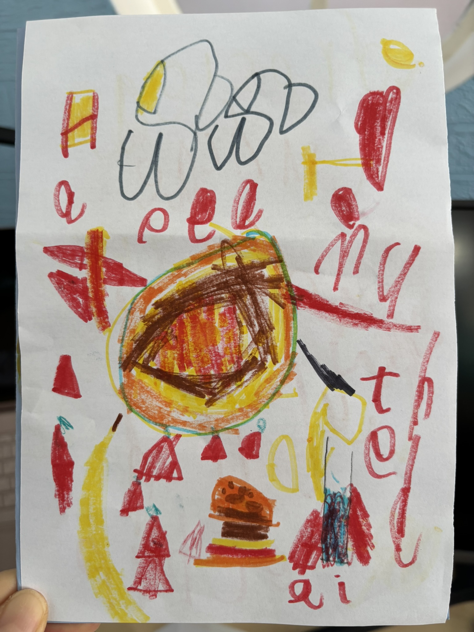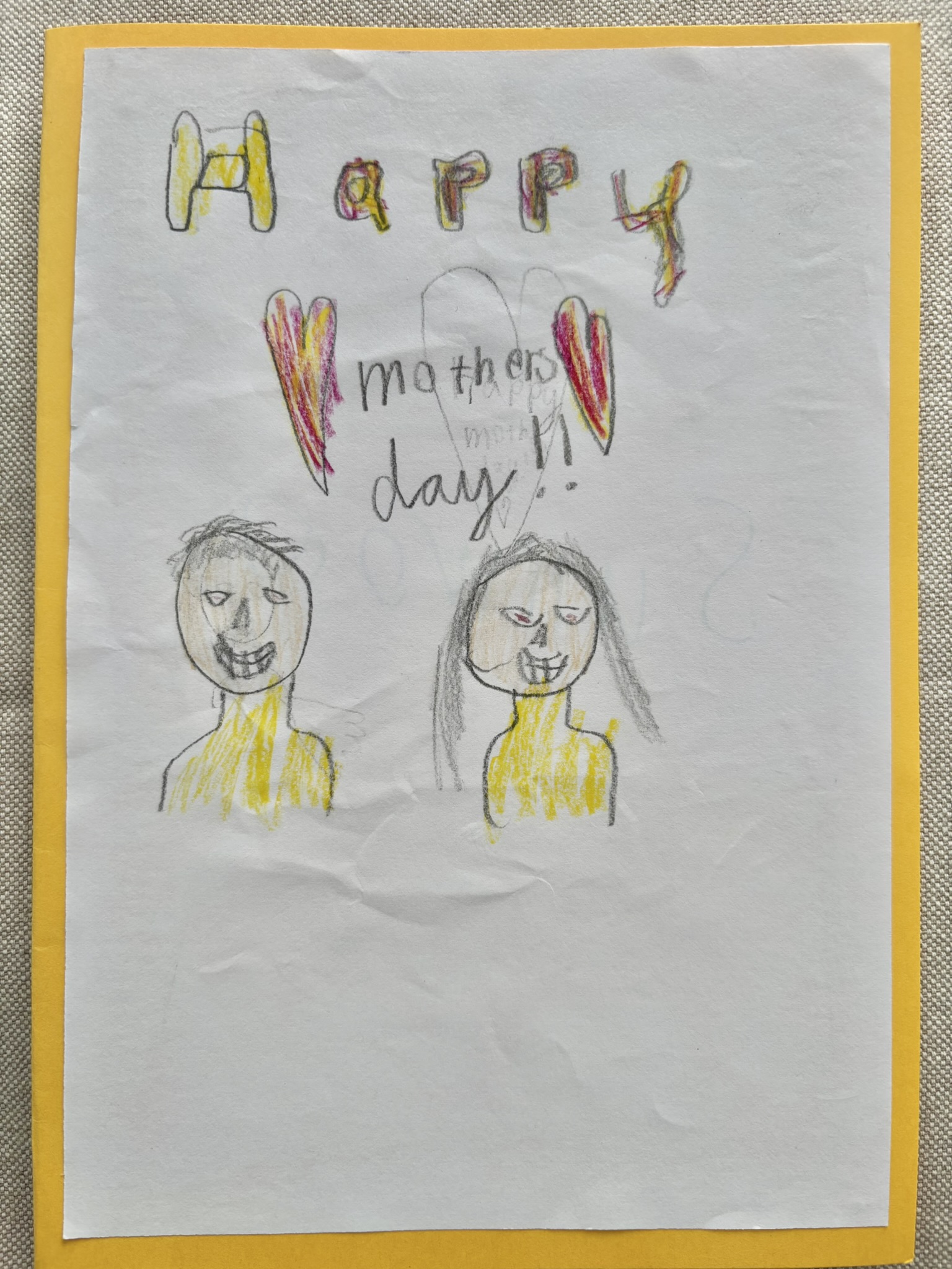카드를 만들고 시간이 남았던 걸까, 또 다른 종이에도 신나게 뭔가 열심히 그리고 적어왔다. Hapee muthel dai (Happy Mother's Day) 라고 적어놨다. 엄마만 알아볼 수 있는 글씨. ㅋㅋㅋ 그림은.. 자기가 좋아하는 어멍거스 캐릭터와 또.. 뭘 그린 걸까.