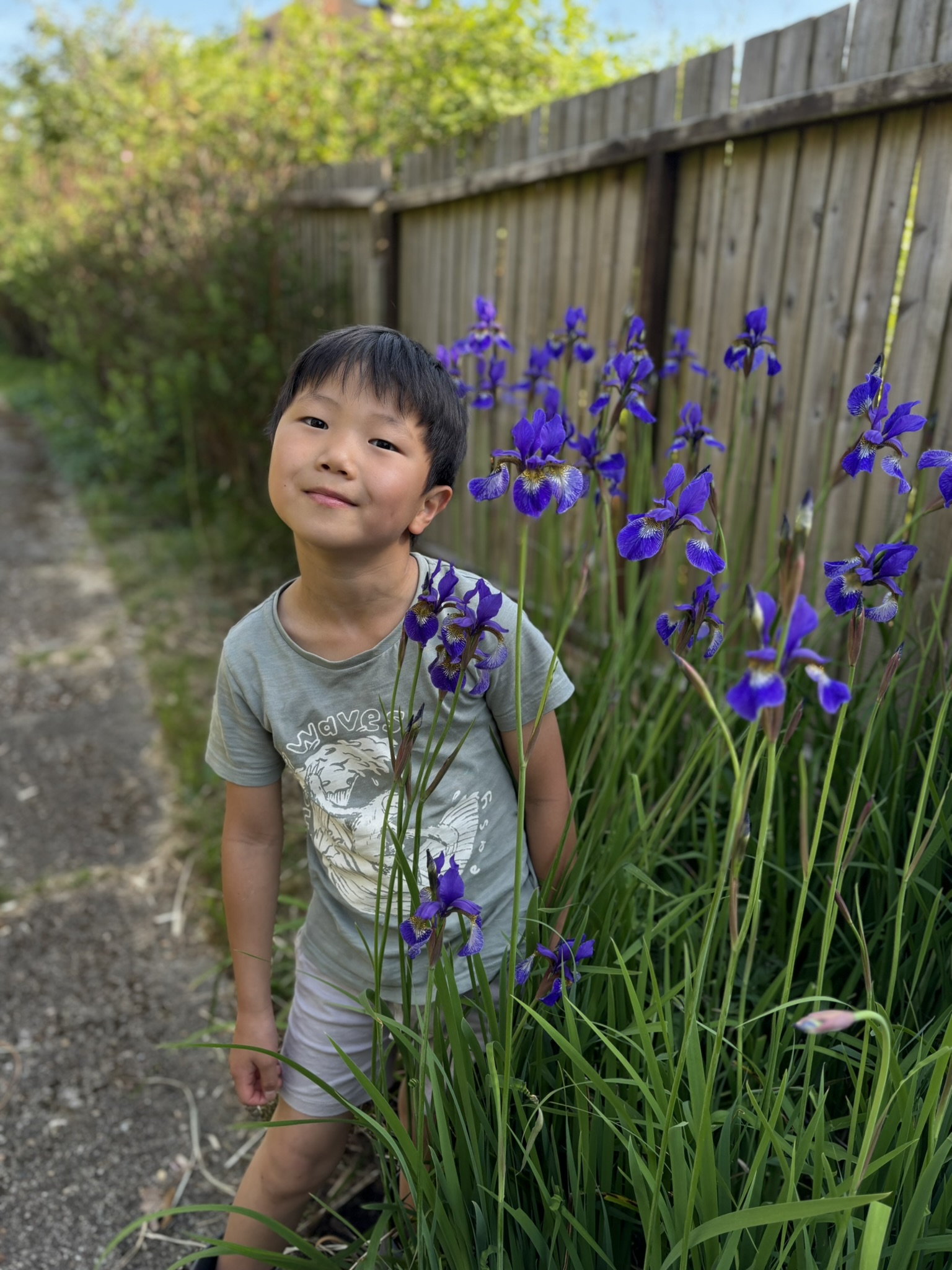 마지막으로, 가장 최근에 꽃을 틔운 보라색 붓꽃. 예전엔 키가 저렇게 크지 않았는데, 올해는 첫째 잭만큼이나 크게 자랐다. 꽃을 정말 좋아하는 잭. 붓꽃과 사진을 찍어줬더니, 자기도 사진을 찍고 싶다고 내 핸드폰을 들고 가서 사진을 찍었다. 꽃 사진도 찍고, 가든 사진도 찍더니 엄마도 찍어주겠다 하며 내 사진도 찍어줬다. 아이가 내게 카메라를 들이밀면 내가 아이들 사진을 찍을 때 아이들 기분은 어떨지 실감하게 된다. 아이가 핸드폰 카메라 설정을 어떻게 한건지, 배경은 하얗게 지워진 흑백사진이 만들어졌다. 내가 찍은 아이의 사진 속 표정과 내 표정이 묘하게 닮아있는 것 같아서 기분이 좋았다.