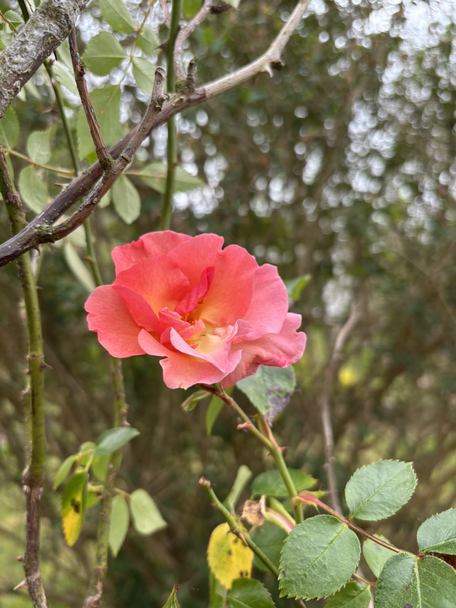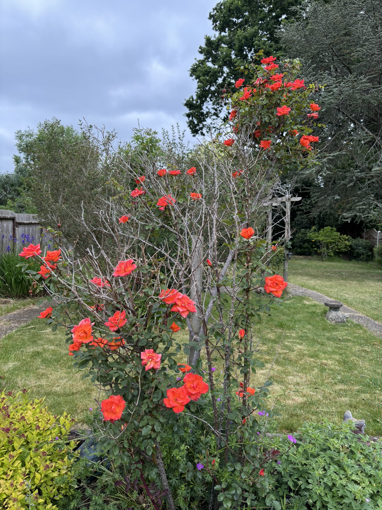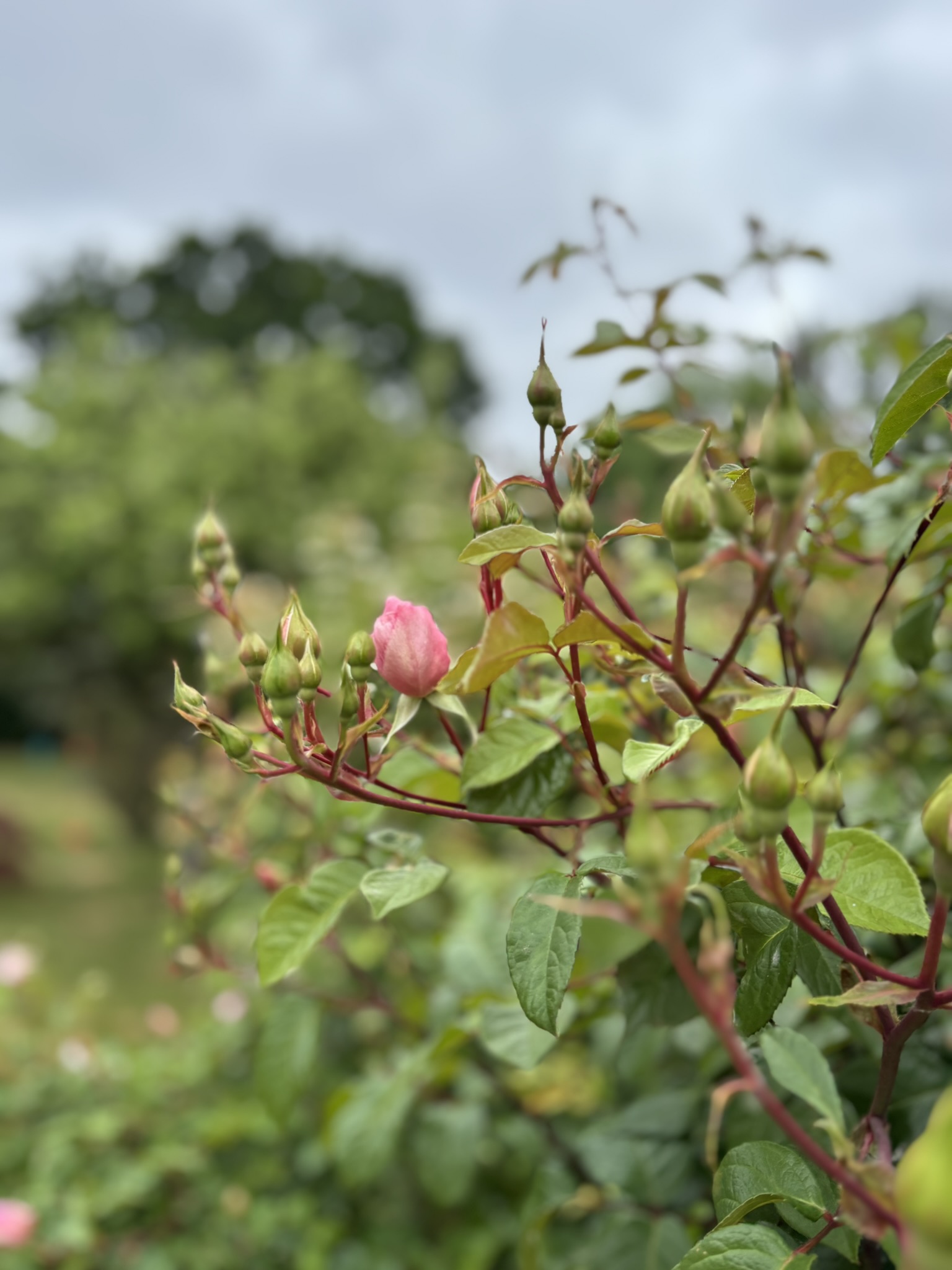 날이 흐린 날, 나 혼자서는 가든을 잘 나가지 않는 편인데도 흐린 하늘 속에 나를 불러들인 빨간 전구 같은 장미. 회색 하늘과 흐린 공기 속에서 다홍색의 장미가 더 밝아 보였다. 흐림 속에서 더 빛나는 아이.