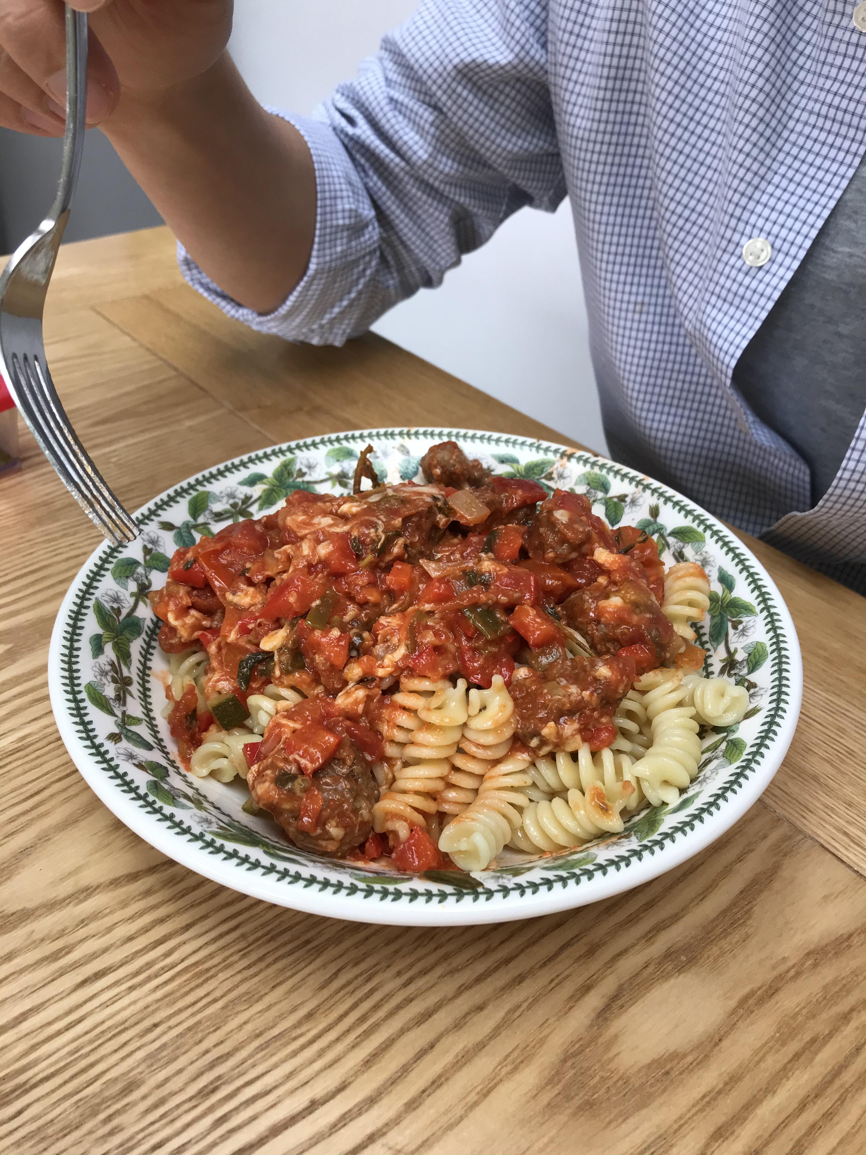 오늘은 식빵과 베이글로 아침을 먹고, 애들용 요거트로 다같이 후식을 먹었다. 점심으로 라따뚜이 비스무레한 것을 만들어 파스타 위에 얹어 먹고, 틴틴과 나는 메이플시럽 뿌린 그릭요거트로 디저트 (유통기한이 얼마 남지 않아서 의무로 섭취 ㅋ), 잭 낮잠 후 잭과 딸기와 블루베리를 먹고, 저녁으로 나와 틴틴은 아버카도간장덮밥, 잭은 아보카도를 싫어하는 관계로 점심에 만든 소스를 밥에 얹어 먹었다. 아래 사진은 점심에 먹은 파스타.