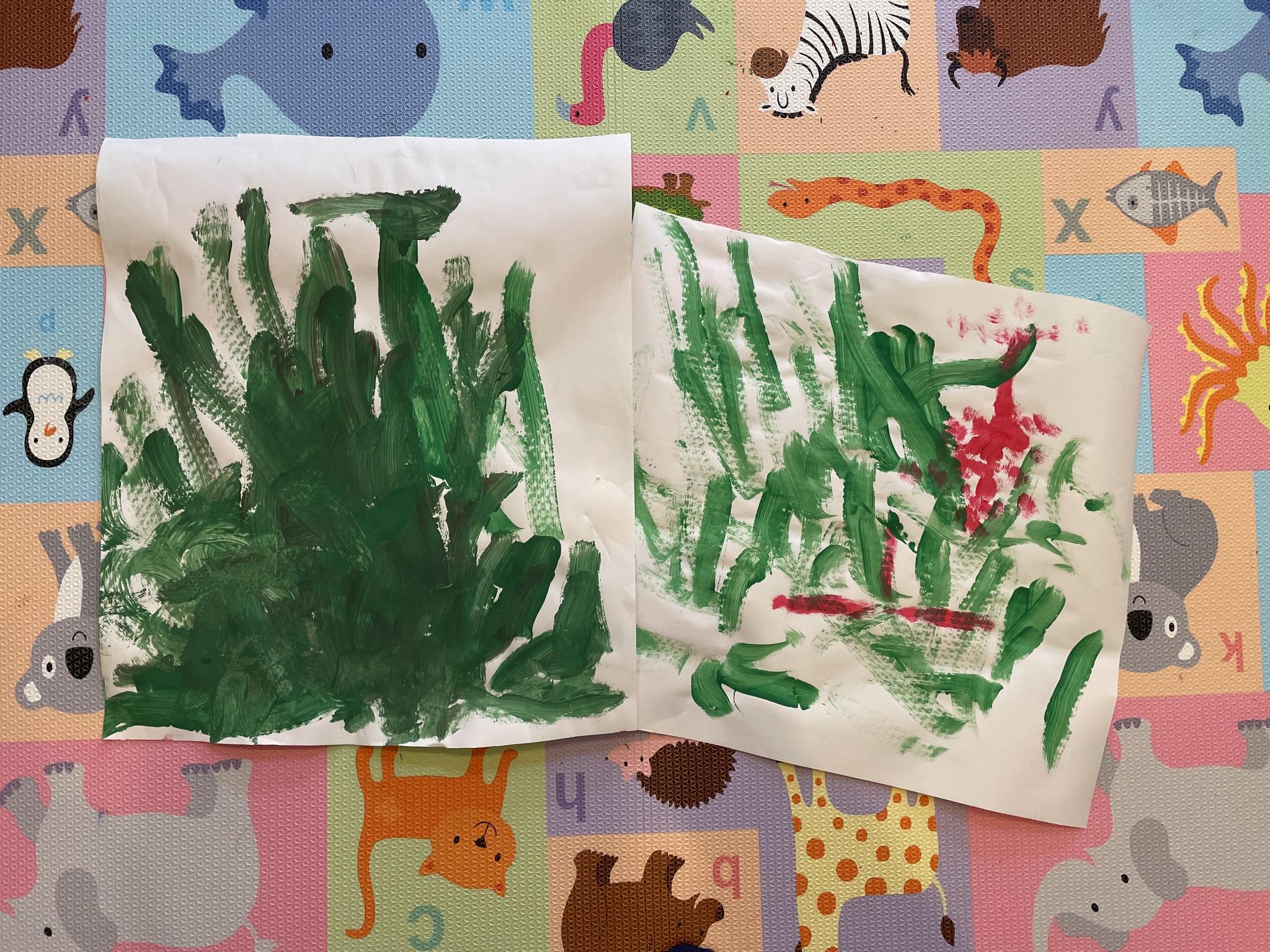 아침에 일어나 나이 작품을 본 저는 깜짝 놀랐어요. 뭔가 초록색 물감으로 아이가 그려둔 붓의 터치가 뭔가 강렬한 느낌을 주는 것 같았거든요. 기후변화 위기의 시대에 딱 맞는 작품같다고나 할까요! 하하하. 네, 제가 바로 아들 바보 엄마, 맞습니다. ^^