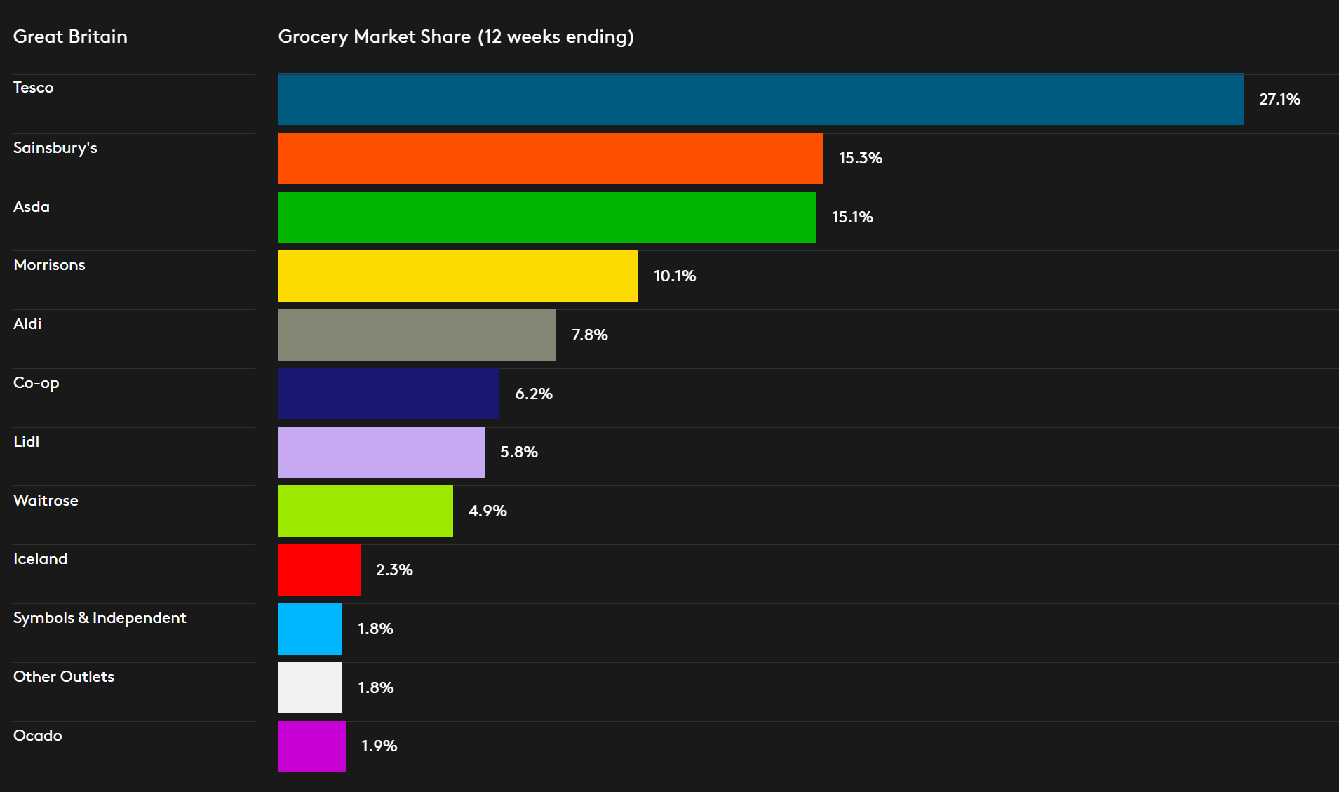 영국 마트들의 가격이 이렇게나 차이가 난다면, 각 마트들의 시장 점유율은 어떤 수준인지 궁금하시지요?