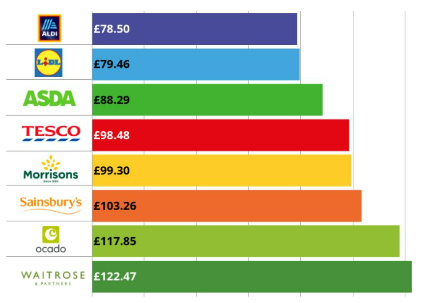 위 그래프는 영국의 소비자보호단체라 할 수 있는 Which? 라는 곳에서 2020년 7월에 조사한 결과인데요. 계란, 파스타, 우유, 빵 등 기본적인 식재료 80여가지 항목을 동일하게, 혹은 최대한 비슷하게 쇼핑했을 때 마트별로 가격이 어떻게 차이나는지를 조사한 결과입니다.