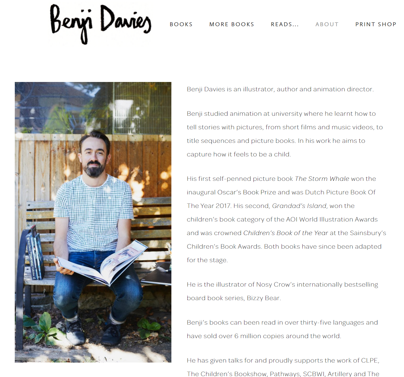 위에 적힌 소개글을 보니 이 책은 벤지 데이비스 작가가 처음으로 글과 글 모두를 혼자서 작업한 책으로, 2017년 영국 아동도서상인 Oscar's Book Prize를 받았다고 하네요. 이 상은 취학전 연령의 아동들을 위한 책을 대상으로 상을 주는 영국 아동도서상이라고 해요. 그 외에도 이 분의 책들이 수상경력이 화려하네요. 관심있으신 분들은 이 분의 홈페이지(링크 클릭)를 방문해보세요.
