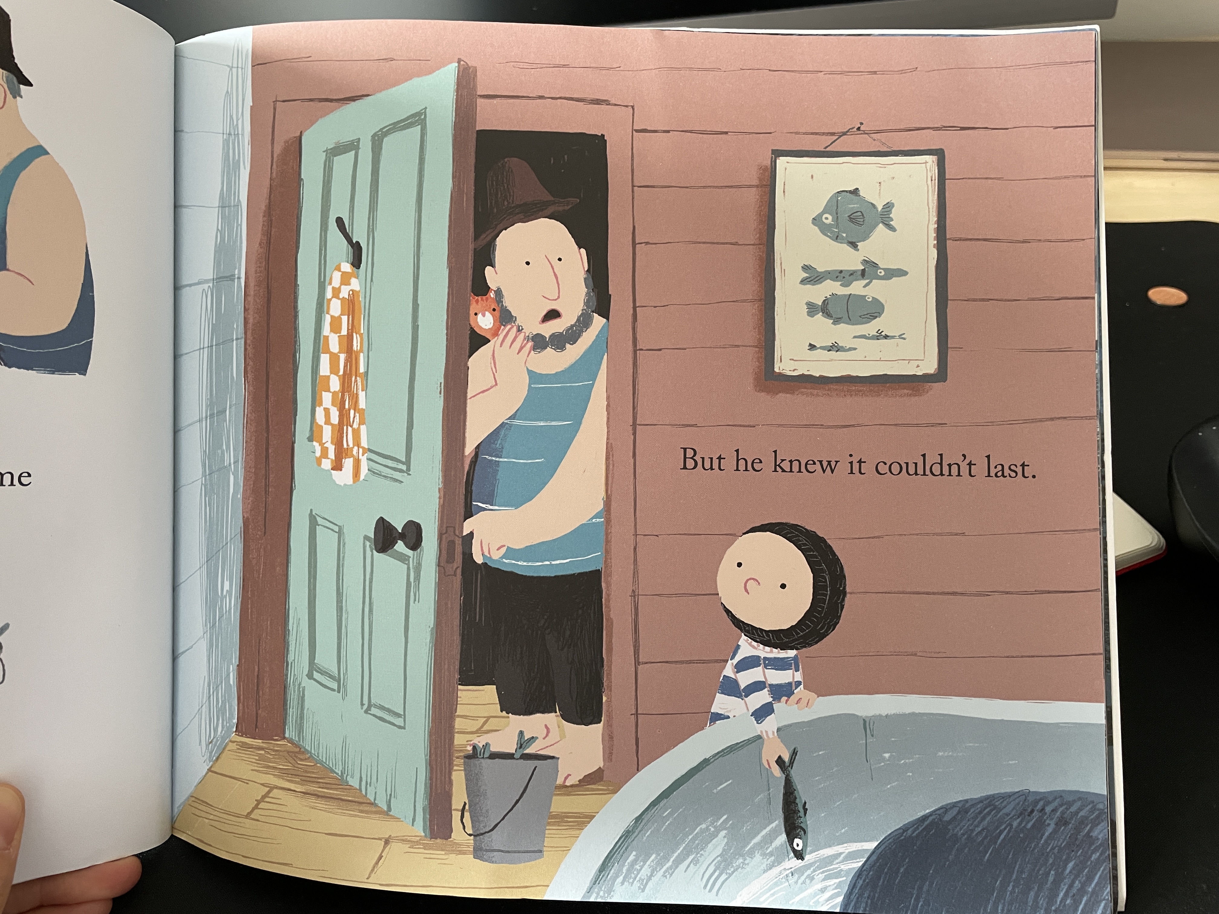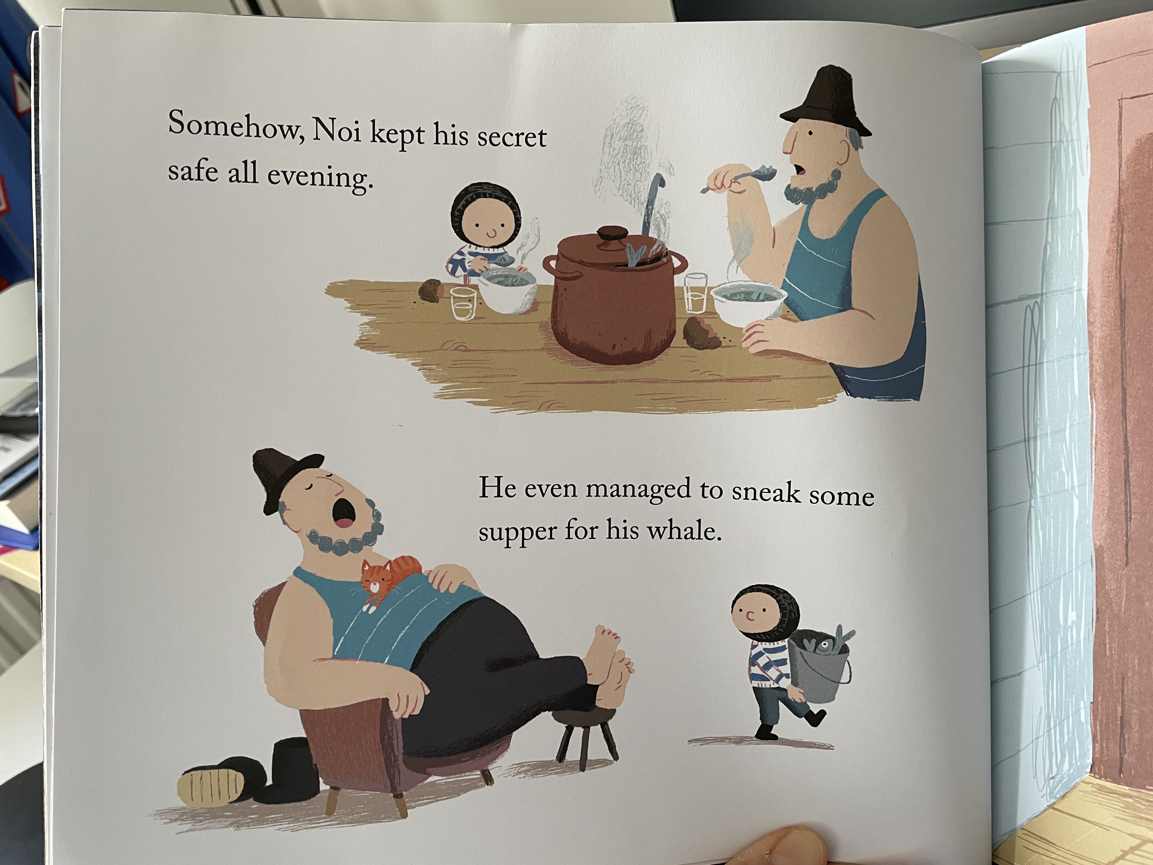 노아는 욕조에 고래가 있다는 것을 아빠가 알면 화를 낼까봐 아빠가 돌아온 후에도 아빠에게 아무 말을 하지 않습니다. 아빠가 잠시 조는 사이 아빠가 잡아온 물고기를 들고 고래에게 밥을 주러 갑니다.