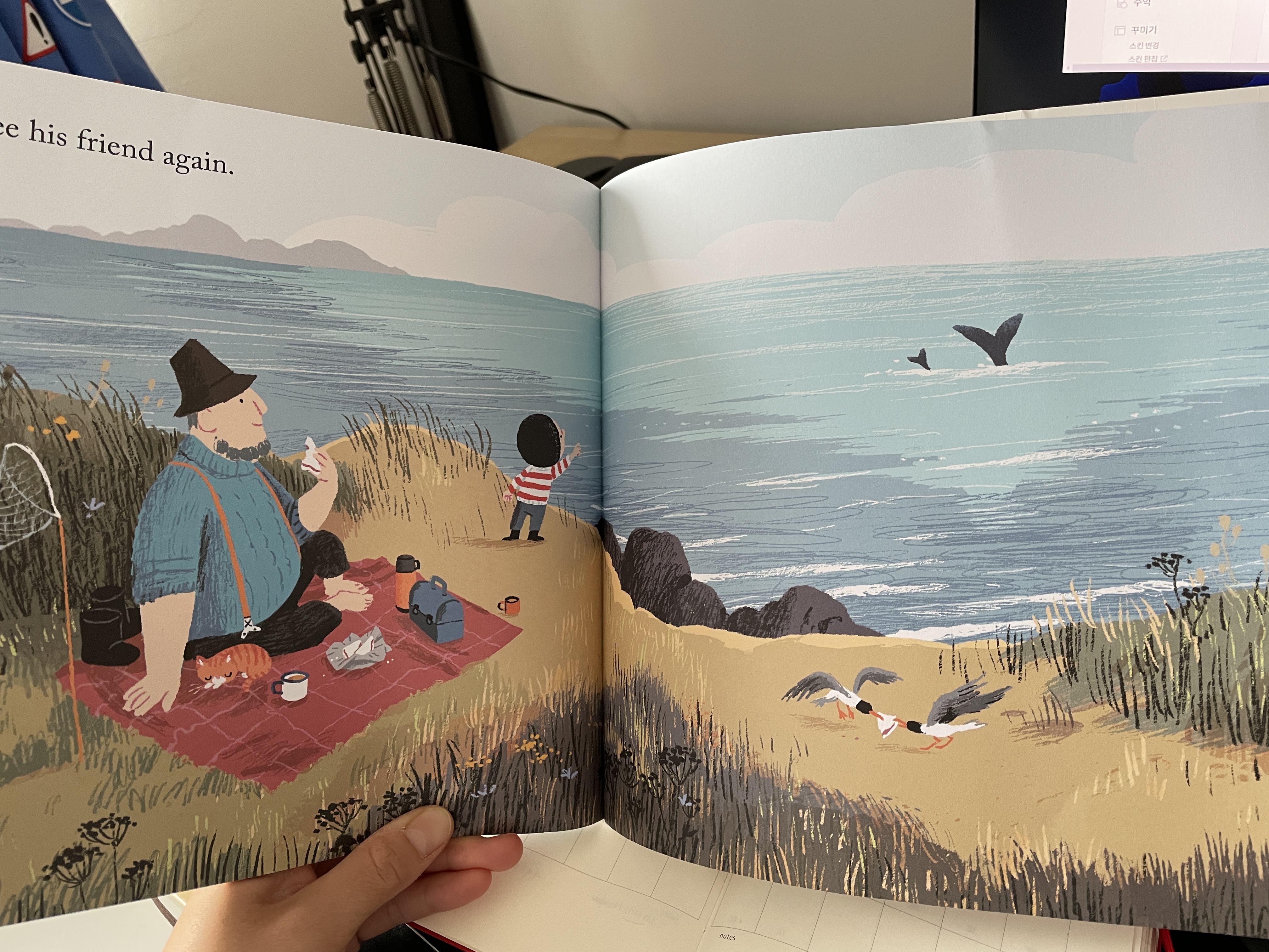 - 아빠와 피크닉할 때 다시 나타난 고래 가족: 바닷가에 고래가 꼬리를 보이며 헤엄쳐 온 것도 인상깊은 장면이에요.