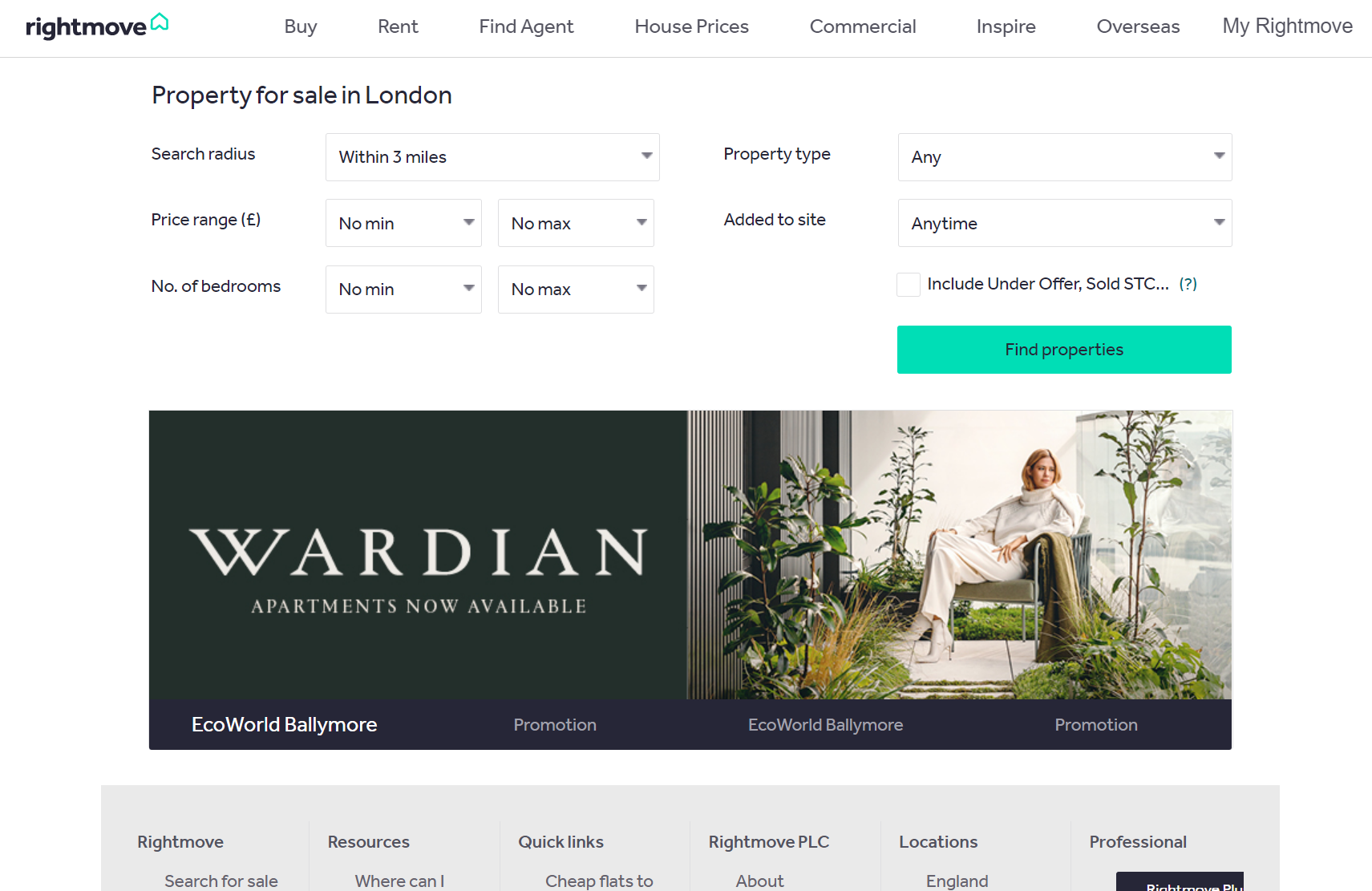 영국의 부동산 매물을 검색하는 가장 대표적인 사이트는 Rightmove 라는 웹사이트입니다. https://www.rightmove.co.uk/로 들어가시면 됩니다. 많은 부동산들이 여기에 매물을 올려요. 매입할 집을 찾는지, 렌트로 월세를 살 집을 찾는지 클릭하고, 검색하고 싶은 지역명을 입력하면 됩니다.