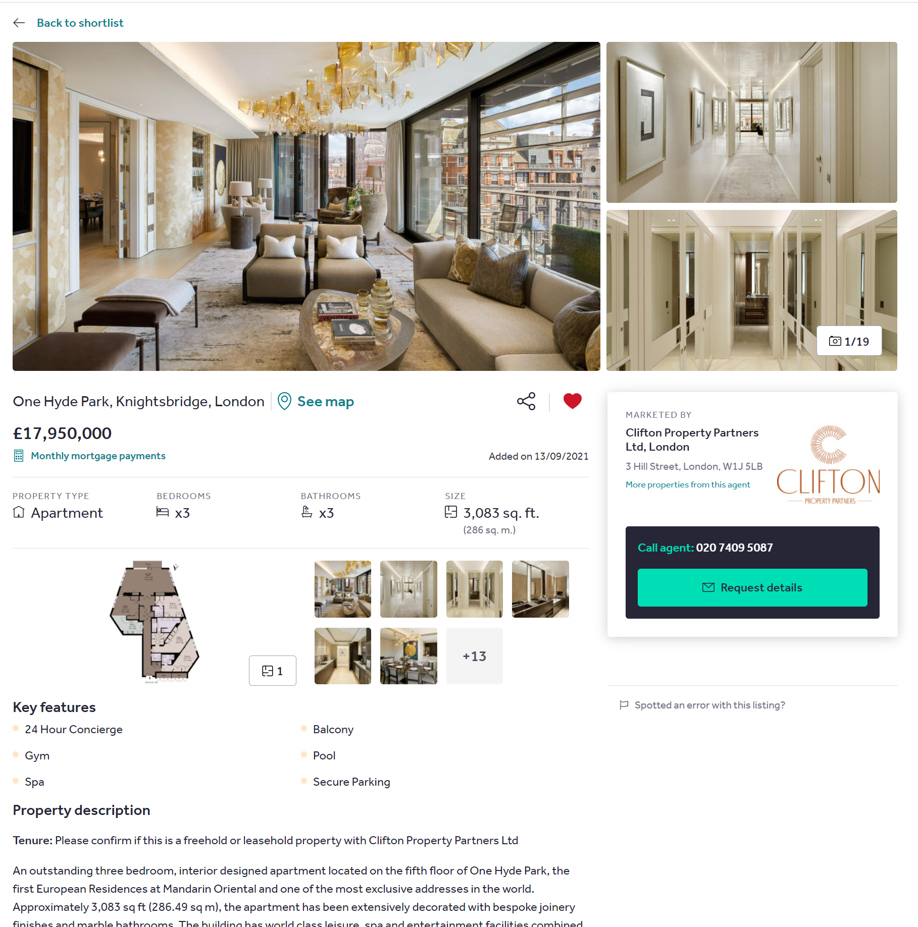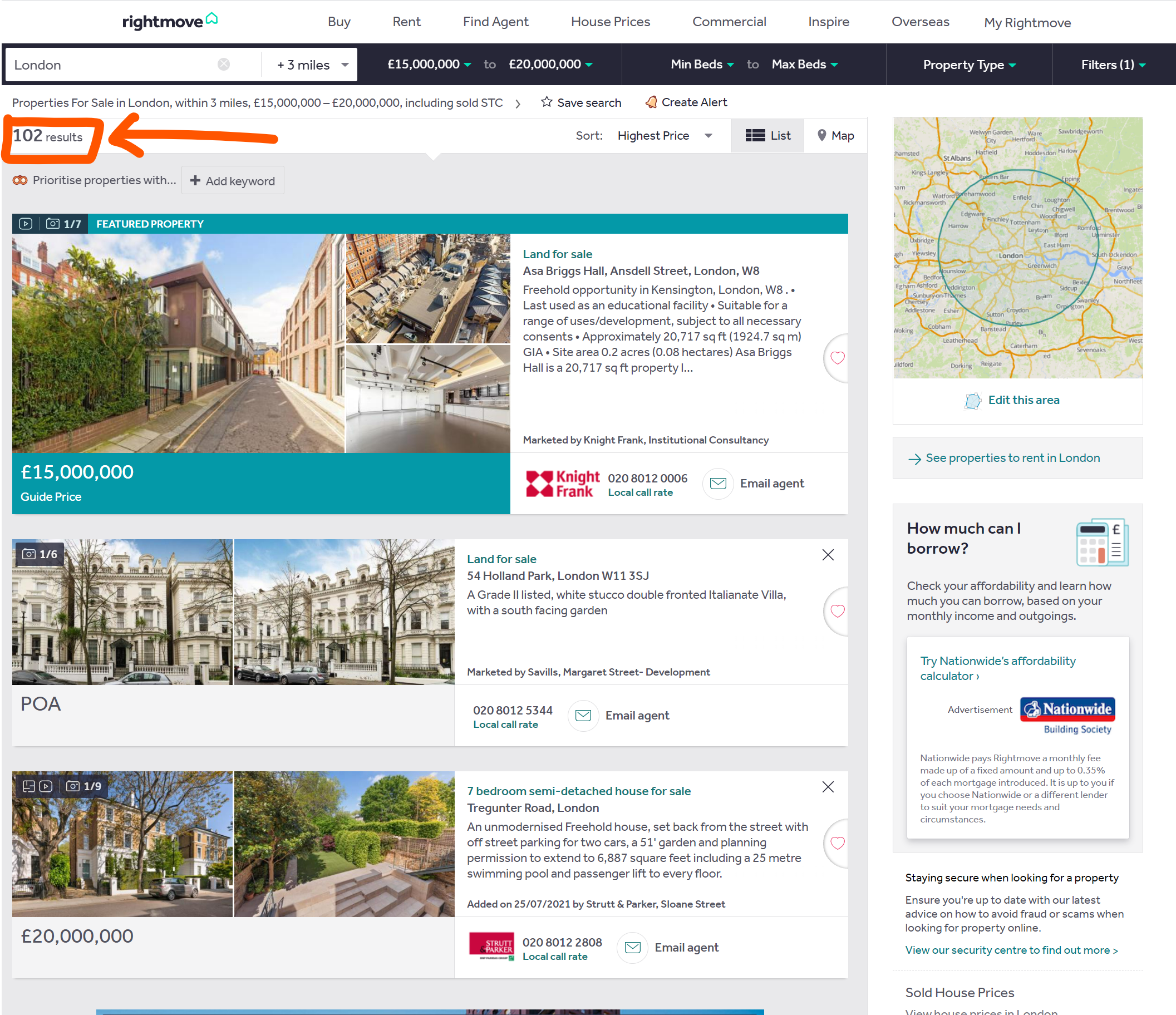저는 일단 런던에서 아파트를 찾아보았습니다. 가격 범위를 1500만 파운드에서 2000만 파운드로 설정해봤어요. 그러니까 200억에서 300억 사이의 매물을 검색해본 거지요. 그랬더니 런던 시내에서 3마일, 그러니까 4.8킬로 반경 이내에서 현재 200억에서 300억 사이 매물이 총 102개가 검색되었습니다.