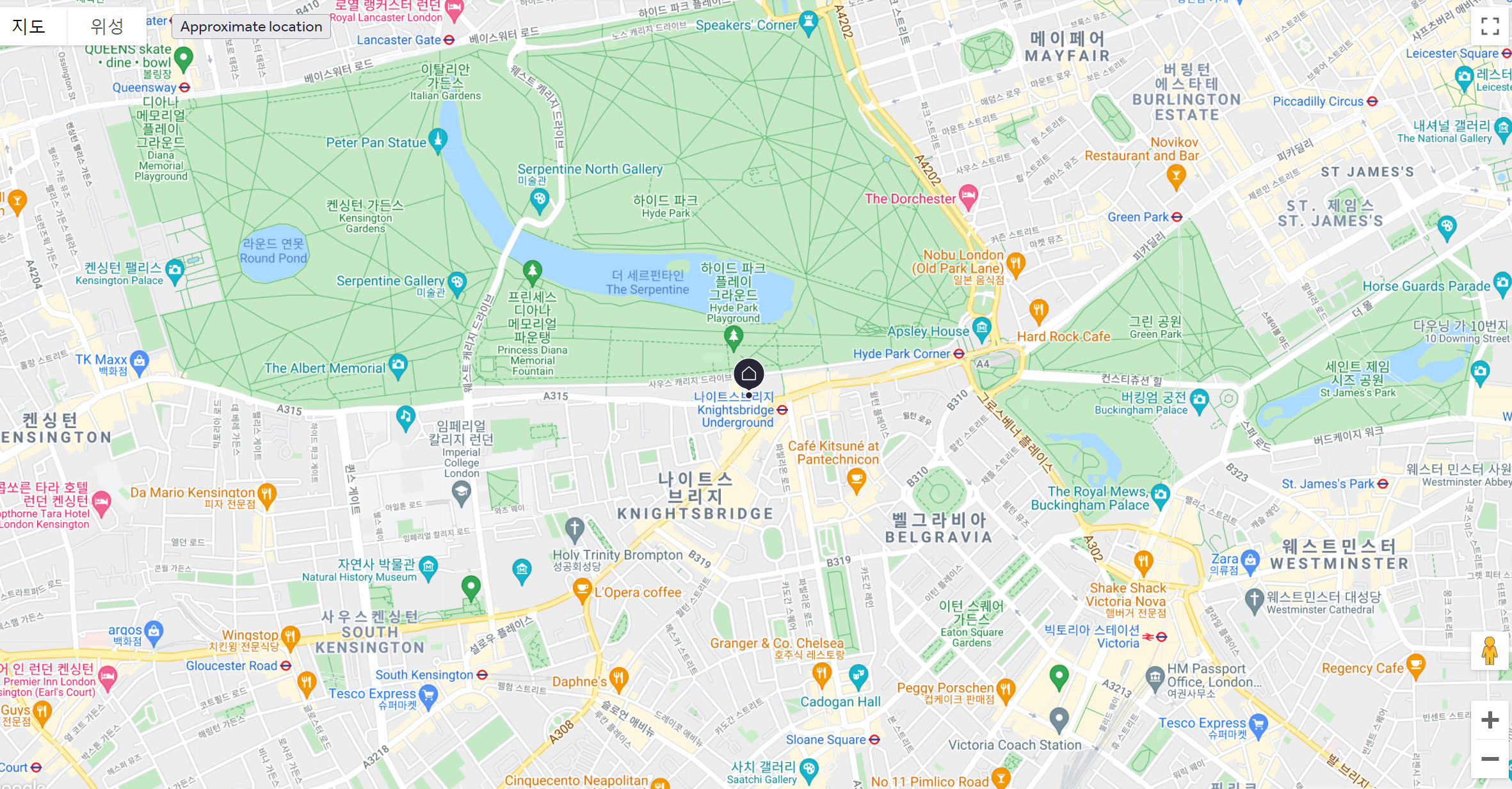 위치는 런던의 하이드파크 근처. Knightbridge 라는 지역이네요.