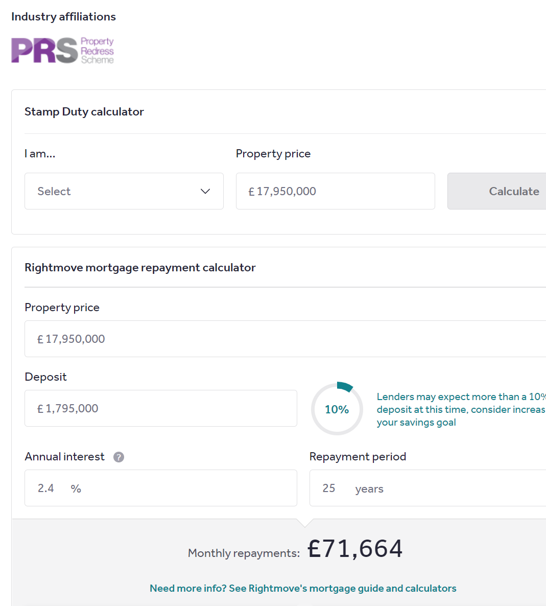 자신의 상황에 맞게 기입해보면 알 수 있는데, 집값의 10%(29억)를 보증금으로 넣을 경우, 연이율 2.4%, 25년 상환 대출시 매달 71,664파운드, 그러니까 1억 1600만원을 은행에 갚으면 25년후 온전한 내집이 될 수 있습니다! 돈 단위가 너무 크다 보니 돈 액수가 보드 게임에서 쓰는 종이돈 같은 느낌입니다.
