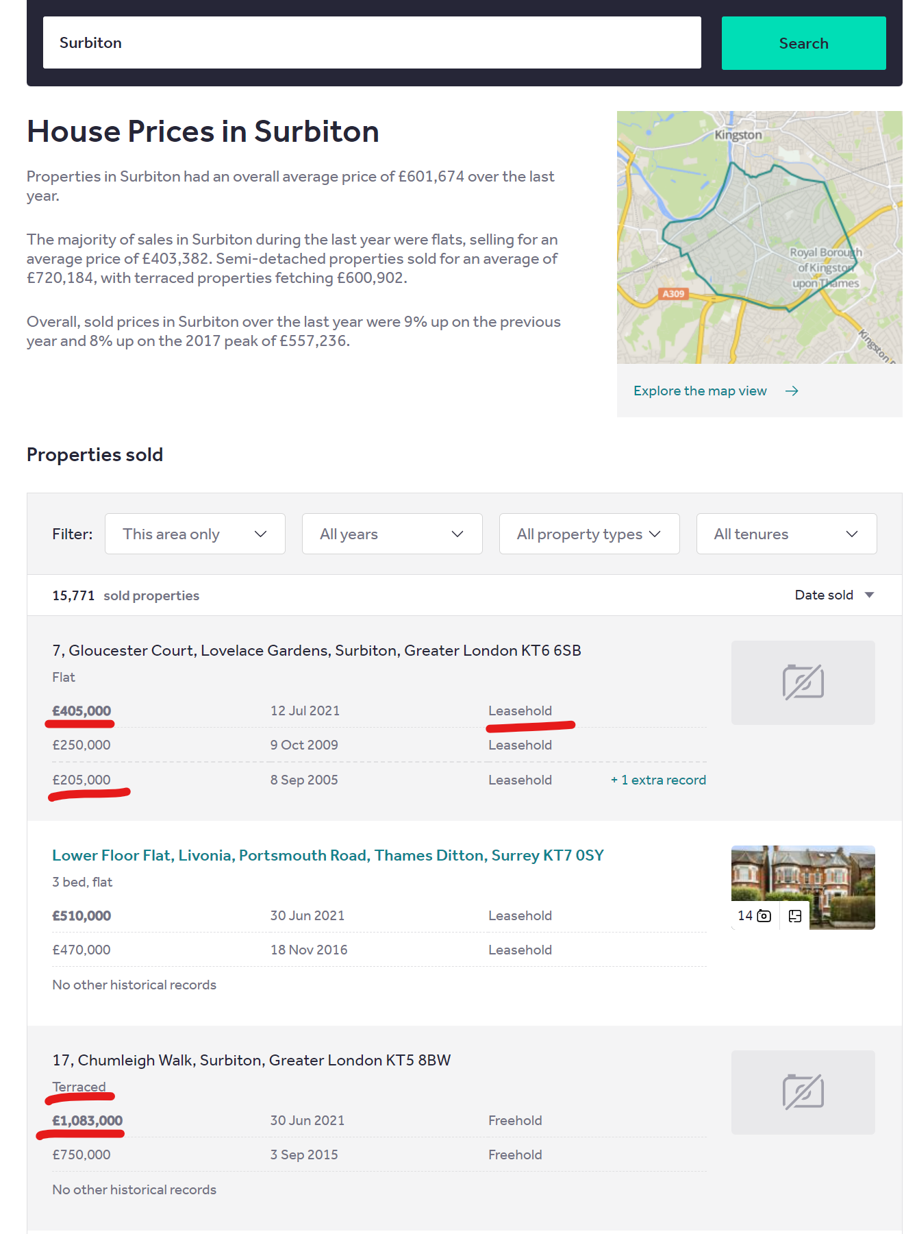 런던으로 출퇴근하는 가정들이 많이 선호한다고 하는 Surbiton 지역을 검색해보겠습니다. 이 지역은 좋은 학교들이 많고, 근처에 아주 크고 유명한 공원도 많으면서 런던 시내 워털루역까지 급행열차가 다녀서 런던에서 일하는 이들에게 인기가 많은 지역이라고 합니다. 최근 거래된 두 곳은 플랫, 즉 아파트 형식이고, 그 다음으로는 terraced house 인 주택이 나옵니다.
