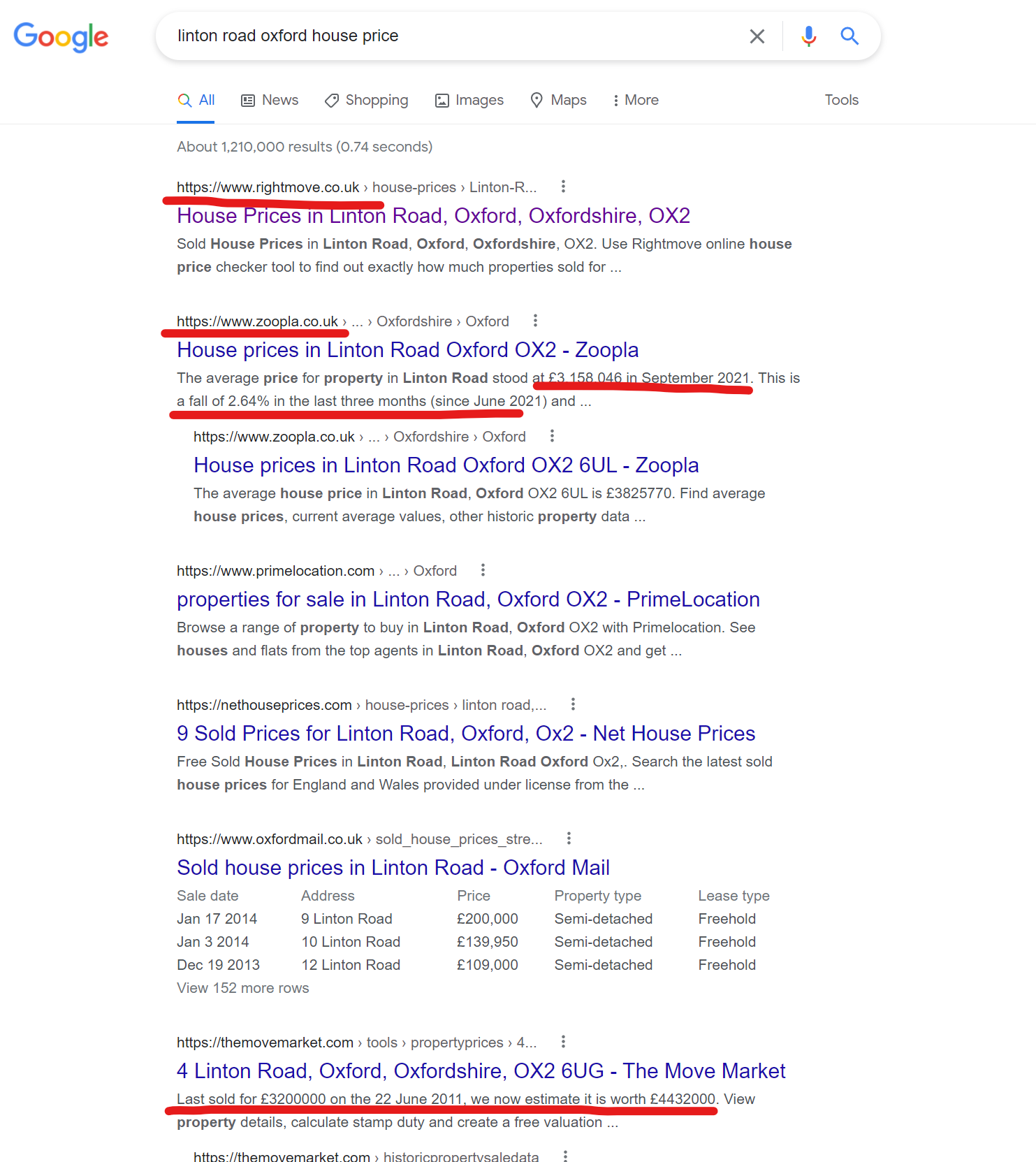 관심 지역의 집값을 검색하는 방법은 매우 쉽습니다. 그냥 구글 검색창에 주소를 입력하고 house price만 붙여서 검색해도 찾을 수 있습니다. 가령, 옥스퍼드에서 제가 살던 기숙사가 있던 곳이 Linton Road라는 곳인데, 구글 검색창에서 Linton road oxford house price 만 검색하면 됩니다.