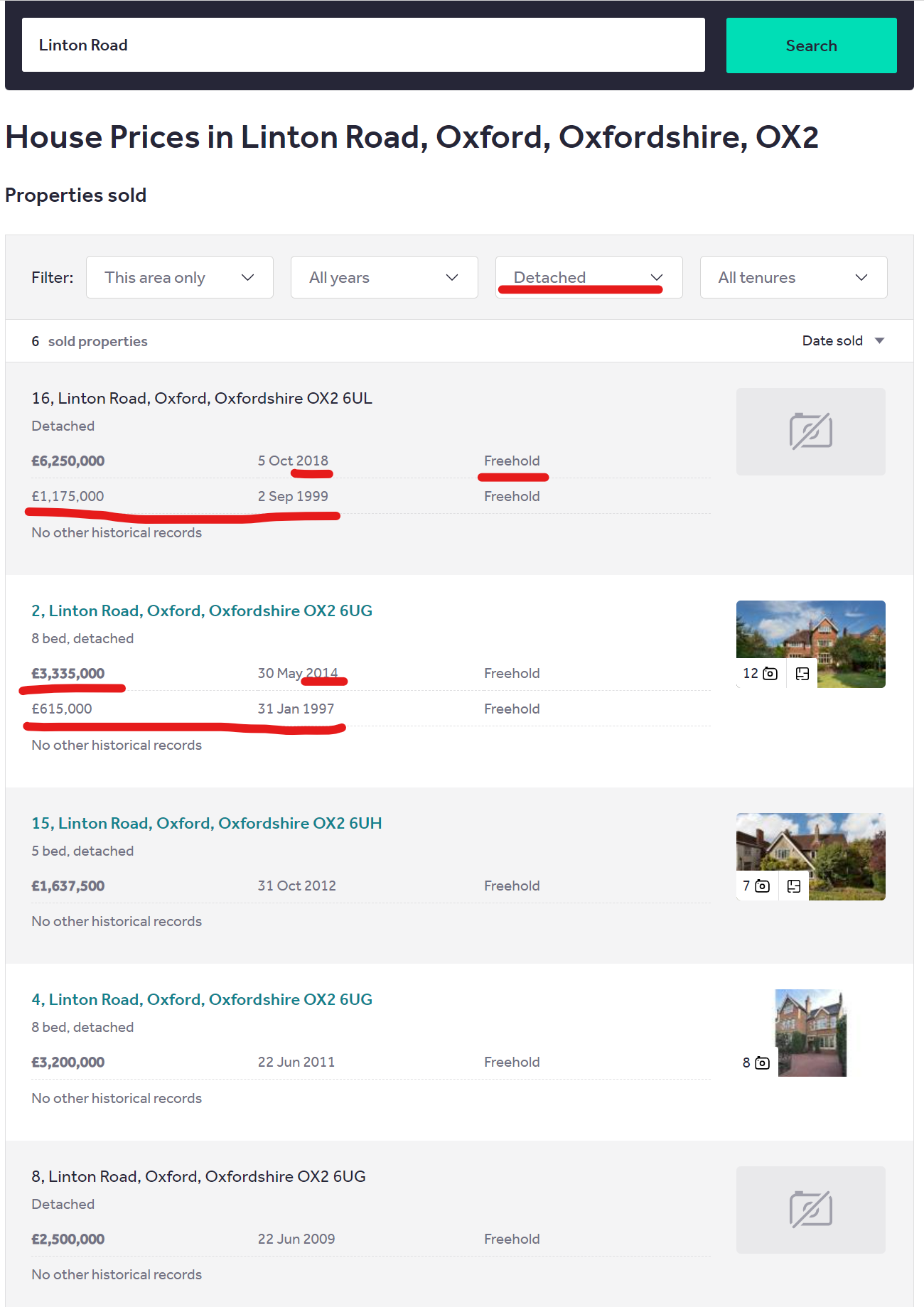 Linton Road라는 이 골목은 긴 골목이 아닌데다 집들이 워낙 커서 그 골목에 있는 집 자체의 수가 적습니다. 그 중 단독주택, 영국에서 Detached house라 분류되는 집들의 가격을 한번 보겠습니다. 아래 스크린샷에서 볼 수 있듯이, 최근 거래된 집들의 가격 뿐만 아니라, 과거 거래된 기록이 있을 경우 그 가격도 보여줍니다. 아래 목록의 기본 정렬은 Date sold로, 최근 거래된 집이 먼저 제시됩니다.