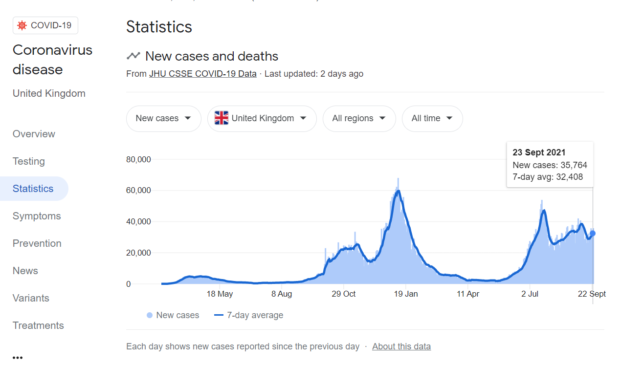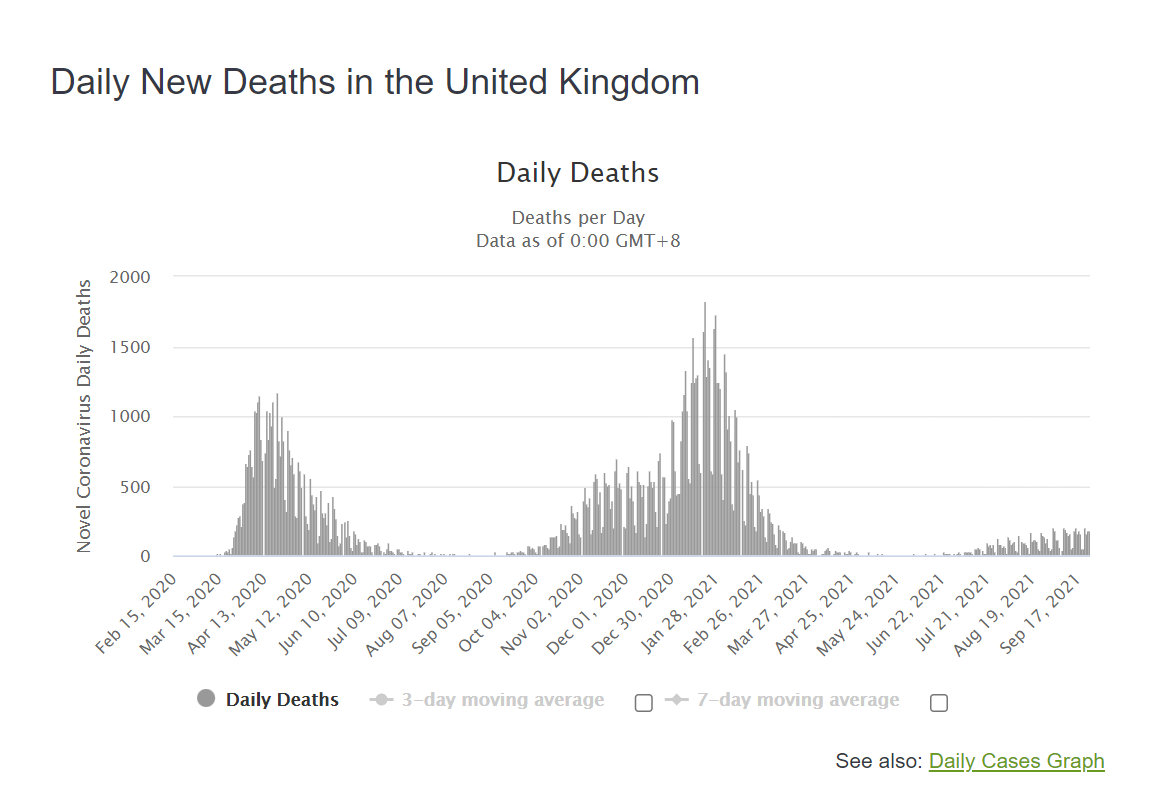 영국은 9월 23일 신규확진자 35,764명. 지난 7일간 평균 32408명. 한국이 확진자 3000명이 넘어 심각한 문제 상황에 돌입한 것과 달리, 영국은 확진자가 그 10배 수준인 상태가 몇 달간 지속되었지만 영국이라는 사회는 그것에 큰 동요가 없다. 영국은 워낙 아래 그래프에서 보다시피 지난 겨울에는 확진자는 더욱 심각한 수준이었고 그와 함께 사망자도 엄청났는데 요즘은 백신접종 확대로 인해 사망자 수는 전에 비해 상당히 줄었기 때문이다.