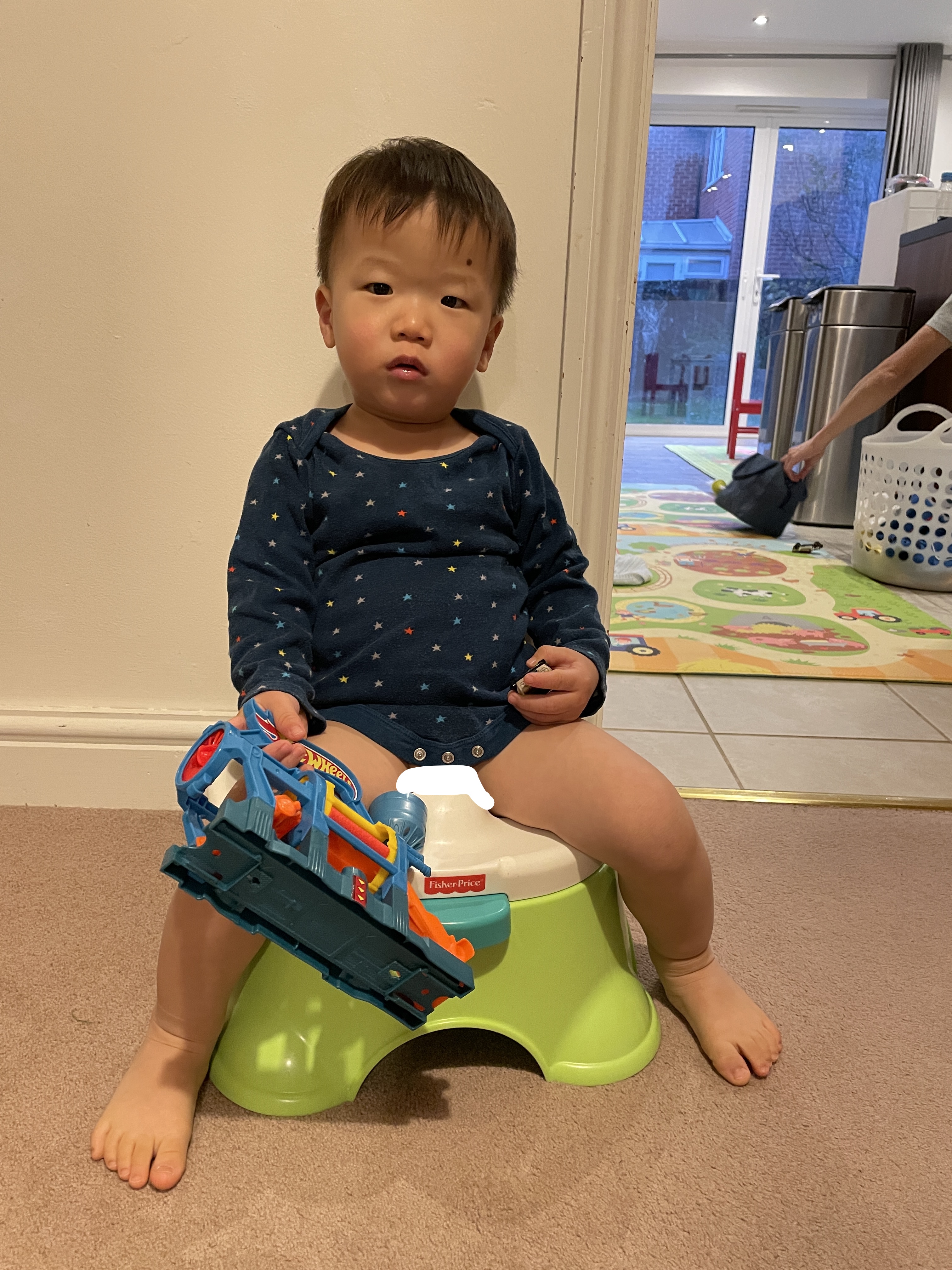 뚱이가 원하는 차를 잭이 주지 않자 뚱이가 자꾸 자동차를 집어던질랑 말랑, 던지는 둥 마는 둥, 사실 던지긴 하는데 혼나지 않으려고 우리 눈치를 살살 살피며 던지며 선을 넘었다 말았다를 반복하고 있다. 잭이 줄지어둔 저 자동차들이 아이들의 미니카 사랑을 대신 받고 있다. 저 중에서 하얀색 자동차를 그렇게 뚱이가 갖고 싶다고 하는데, 처음에는 저 차를 뚱이에게 주려고 했던 잭이 막상 뚱이가 그걸 원하니 그 때부터 저 차를 절대 내어주지 않으려 해서 뚱이가 화가 났다.