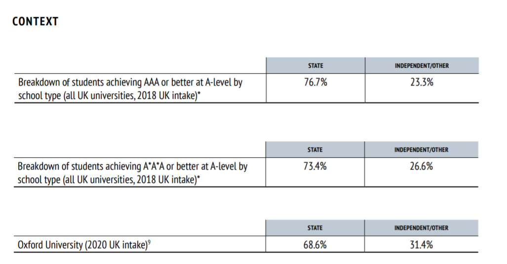 그런데 옥스퍼드에 입학생은 공립학교 출신이 68.6%, 사립은 31.4%로 고득점 성적 비율에 비해 사립학교 출신들 비중이 더 높다는 것을 알 수 있다.