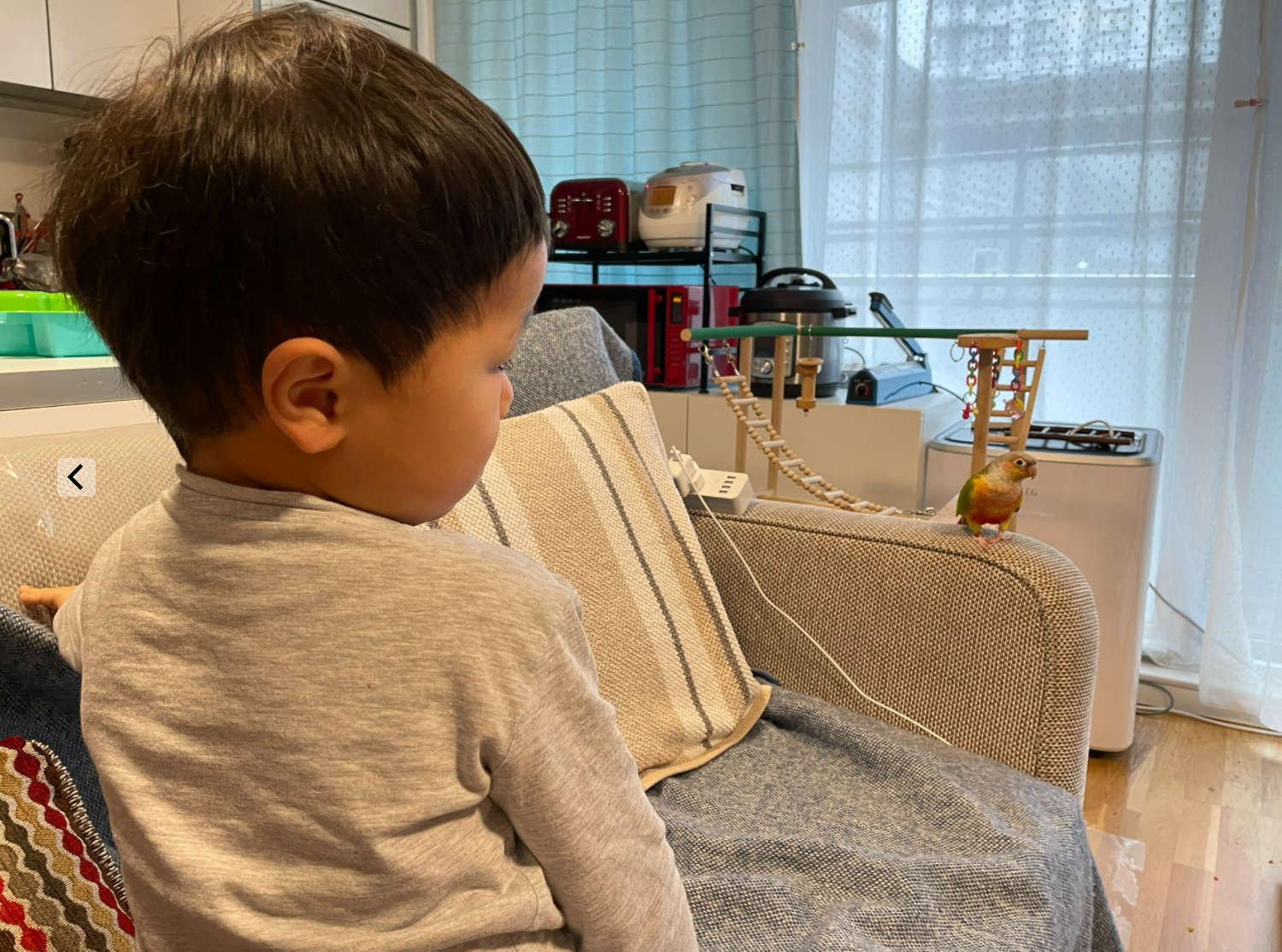 고모가 키우는 애완조예요. 공원에서 보는 새들은 근처에 가기도 전에 도망가는데, 고모집에 있는 새들은 아이들 주변을 어슬렁거리기도 하고, 고모 손 위에도 올라오니, 아이들에게는 정말 흥미로운 존재입니다.