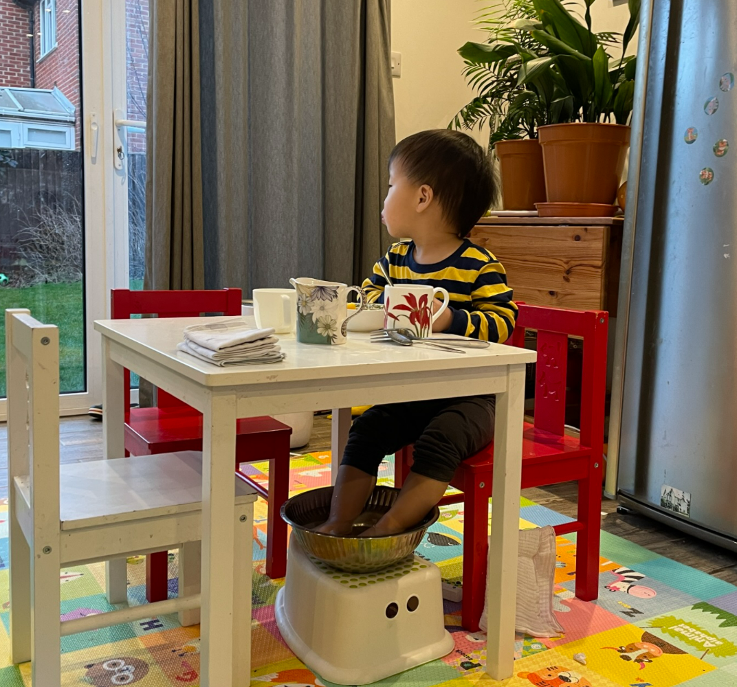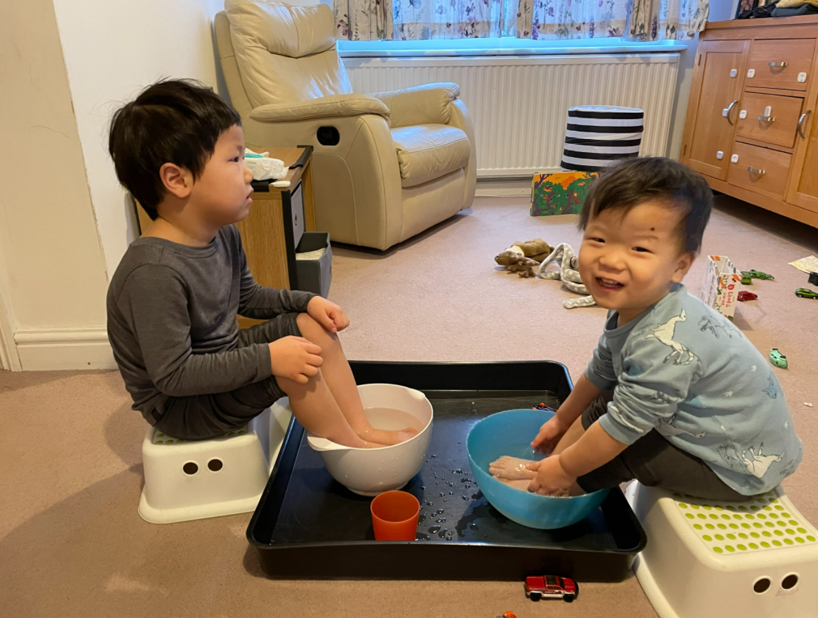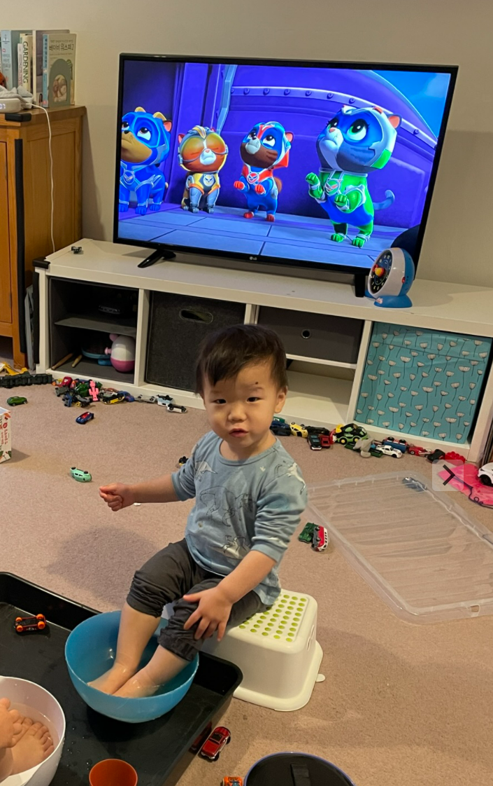 그저께 아침, 잭 발이 너무 차고 아이 컨디션이 좀 좋지 않은 것 같아 보여서 거실에서 티비를 시청 중인 아이를 위해 특별한 서비스를 제공하였습니다. 그건 바로 이름하여 족욕!!!