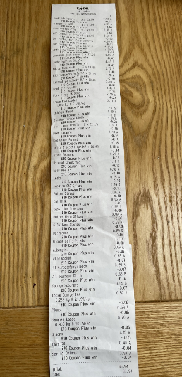 오늘은 고기류를 워낙 많이 사서 돈이 좀 나올 거라고 예상은 했어요. 96파운드가 나왔는데, 10파운드 바우처 할인을 받아 86파운드를 내고 나왔습니다.