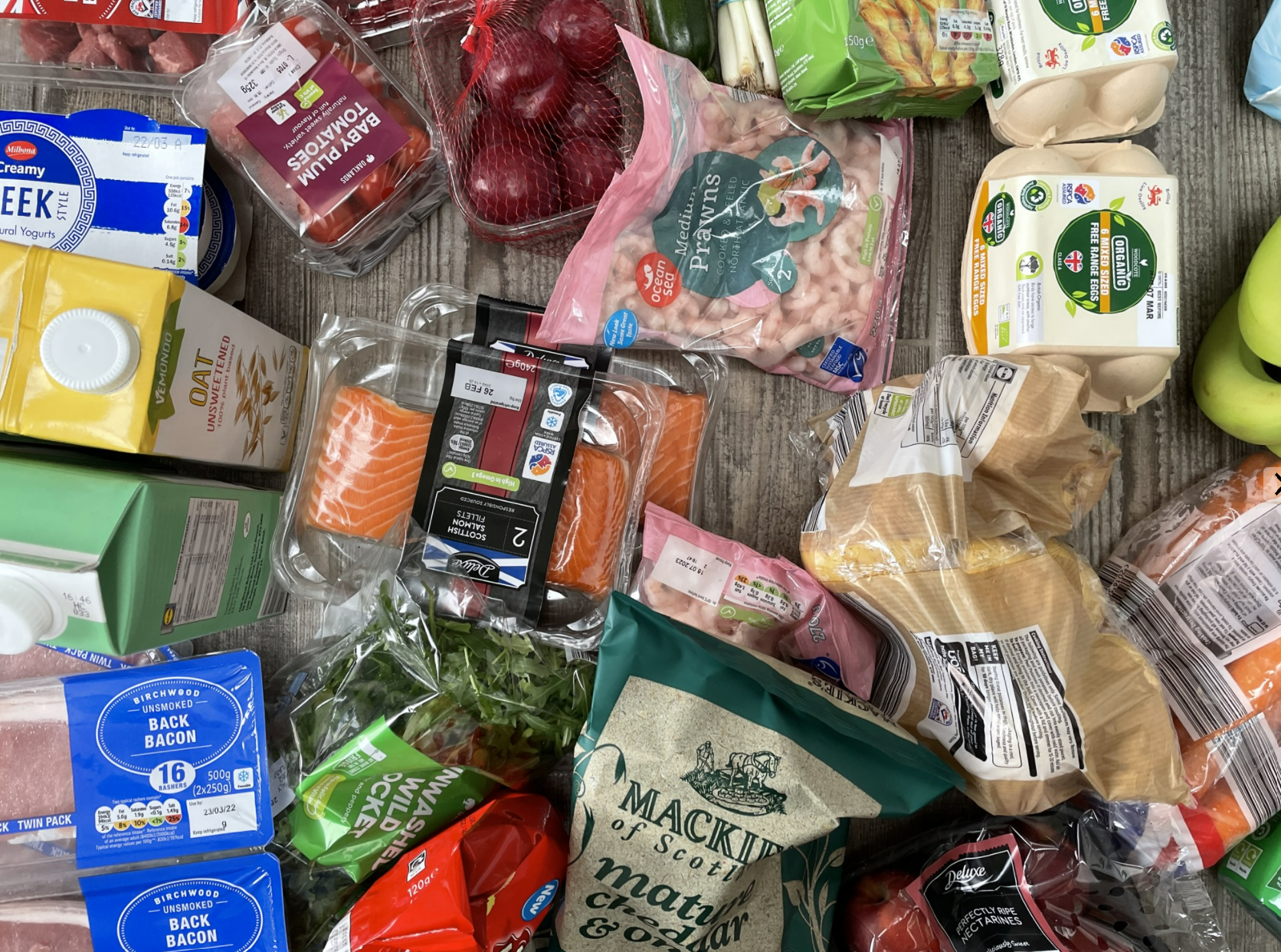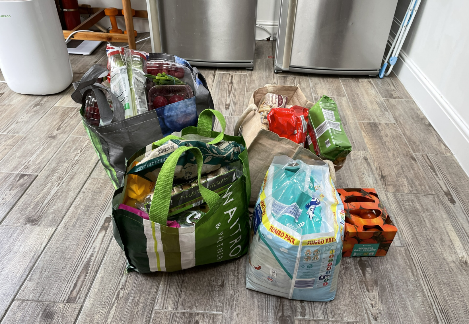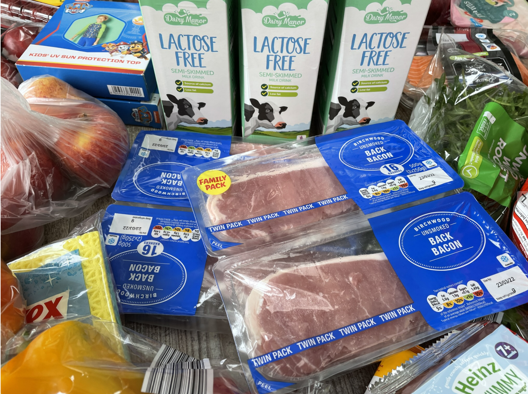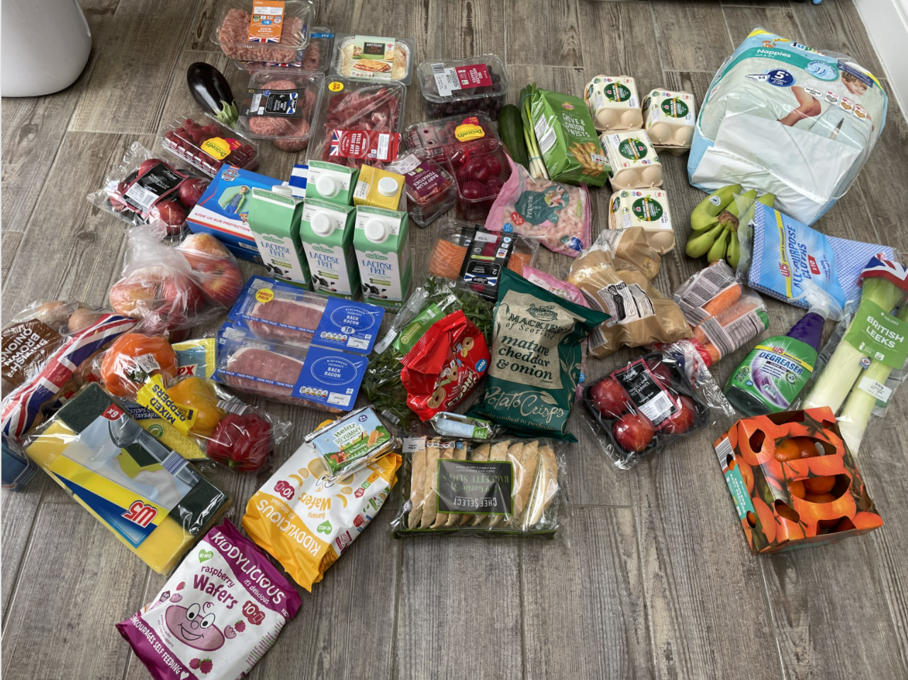 자, 뭘 샀나 구경해보아요. 락토즈 프리 밀크(소화가 잘 되는 우유) 1리터짜리 4팩을 샀구요, 오트 드링크(우유대체품)도 하나 샀어요. 간 돼지고기 한팩, 간 닭고기 한 팩, 버거패티 4장, 국거리용 소고기 한팩, 라자냐 한 팩, 포도 한 팩, 라스베리 두 팩, 넥타린 두 팩, 자두 한 팩, 파, 호박, 유기농계란 24개, 기저귀 한봉지, 바나나, 사과 한봉지, 양파 한팩, 베이컨 4팩, 3색 피망 한봉지, 냉동새우 2팩, 연어 2팩, 귤 한상자, 리크 한 팩, 애들이 좋아하는 Jammy Wheels 두봉지, 애들 쌀과자 두 봉지, 애들 비스킷 두 봉지, 갈릭브레드, 감자 한봉지, 당근 한봉지, 설거지용 스폰지 한봉지, 부엌용 행주 두 봉지, 욕실 청소약 1통, 부엌 청소약 1통, 가지 하나, Rocket 샐러드 한봉지, 내가 좋아하는 Chives & Onion Twists 과자 한봉지, 방울토마토 한 팩, 틴틴이 좋아하는 감자칩 한봉지.