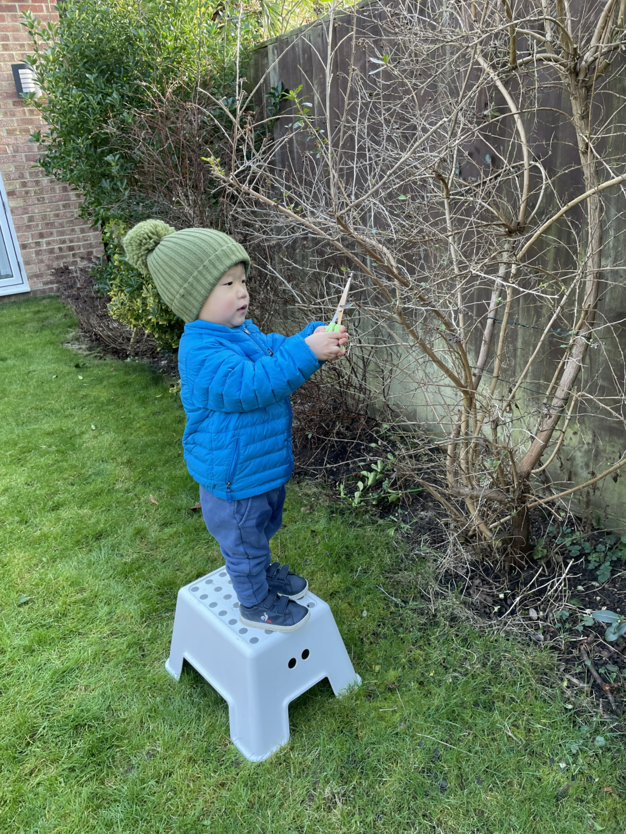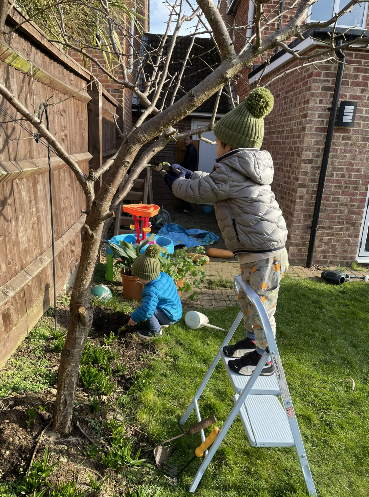 형아가 미니 사다리에 올라서서 가지치기를 하자, 동생도 굳이 거들려고 한다. 둘째는 위험하니 발판에 올라서서 가위를 갖고 작은 덤불의 가지를 자를 수 있게 해줬다.