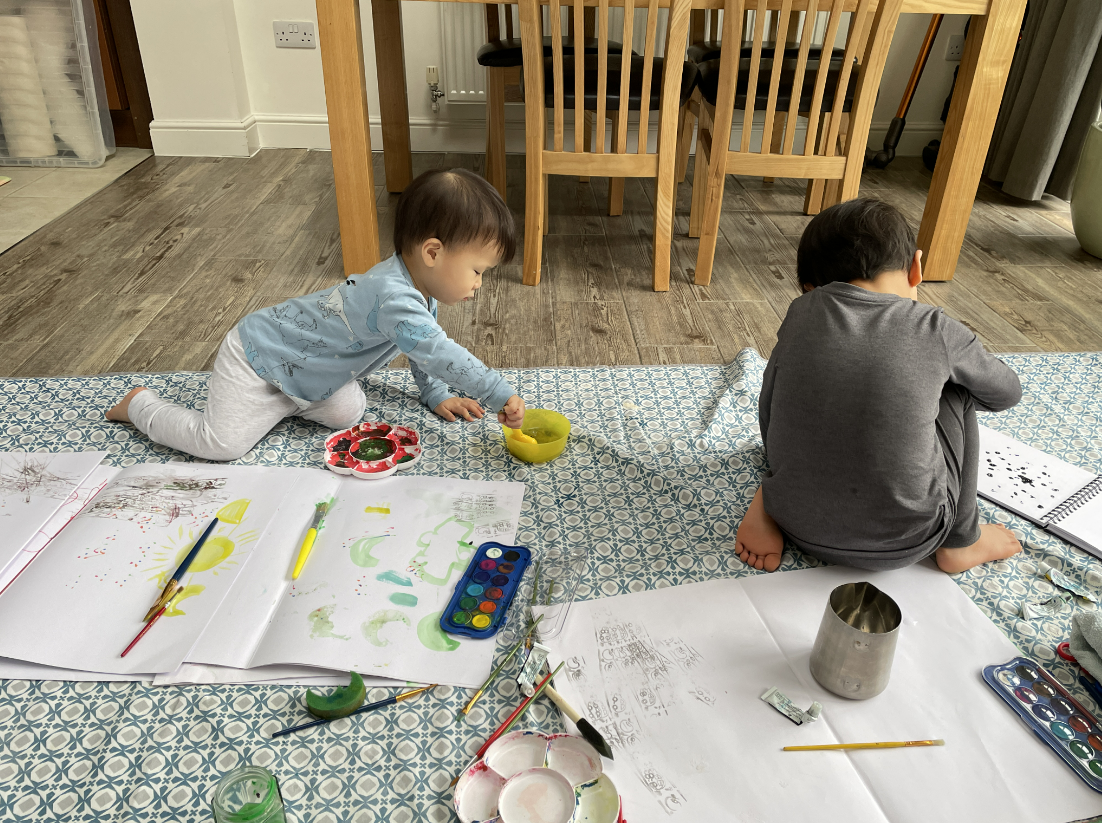 오랫만에 집도 깨끗이 청소했겠다, 물감 물감 아이들이 노래를 불렀는데도 꺼내주지 않았던 것을 오랫만에 할 수 있게 해줬다. 오랫만에 물감을 꺼내놓고 예술혼(?!!!)을 불태우는 아이들.