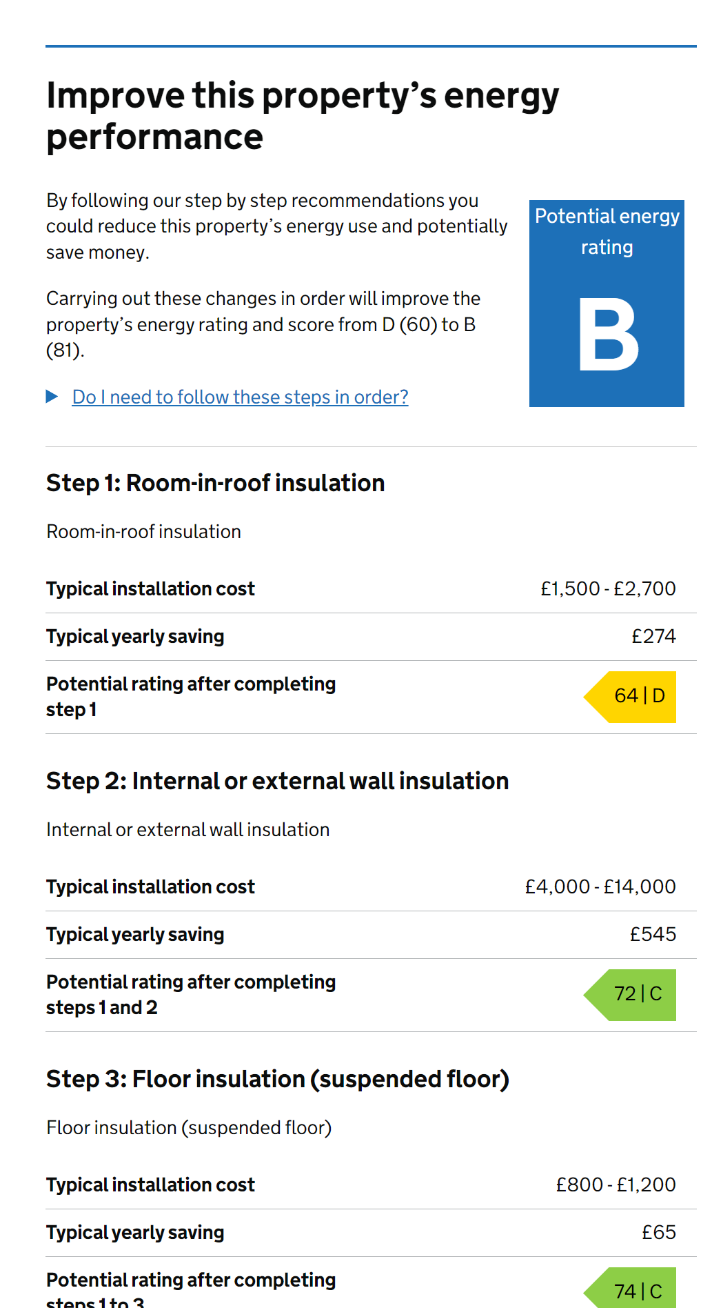 위의 정부 웹사이트에 가서 주소만 검색하면 각 주택의 EPC 상세 보고서를 볼 수 있게 되어 있습니다.