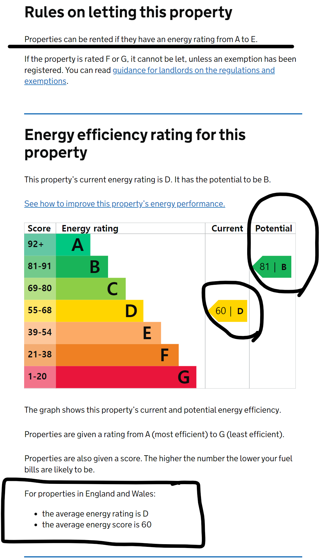 이 EPC를 보면 여러가지 유용한 정보를 더 알 수 있습니다. 영국에서는 세를 놓으려면 집의 에너지 효율 상태가 최소 A에서 E가 되어야 합니다. F인 집은 세를 놓을 수 없게 되어있다는 사실! 바로 아래에 제가 밑줄 그어둔 부분입니다.