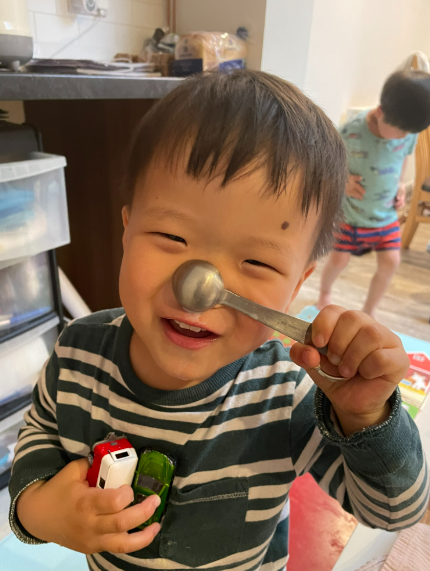 제가 코를 닦아주려는데, 그게 싫다고 생각해낸 게 자기가 들고 있던 계량스푼으로 코를 가리는 거였어요. 그리곤 "선재 코 없어졌다!" 하고 외치는 거죠.